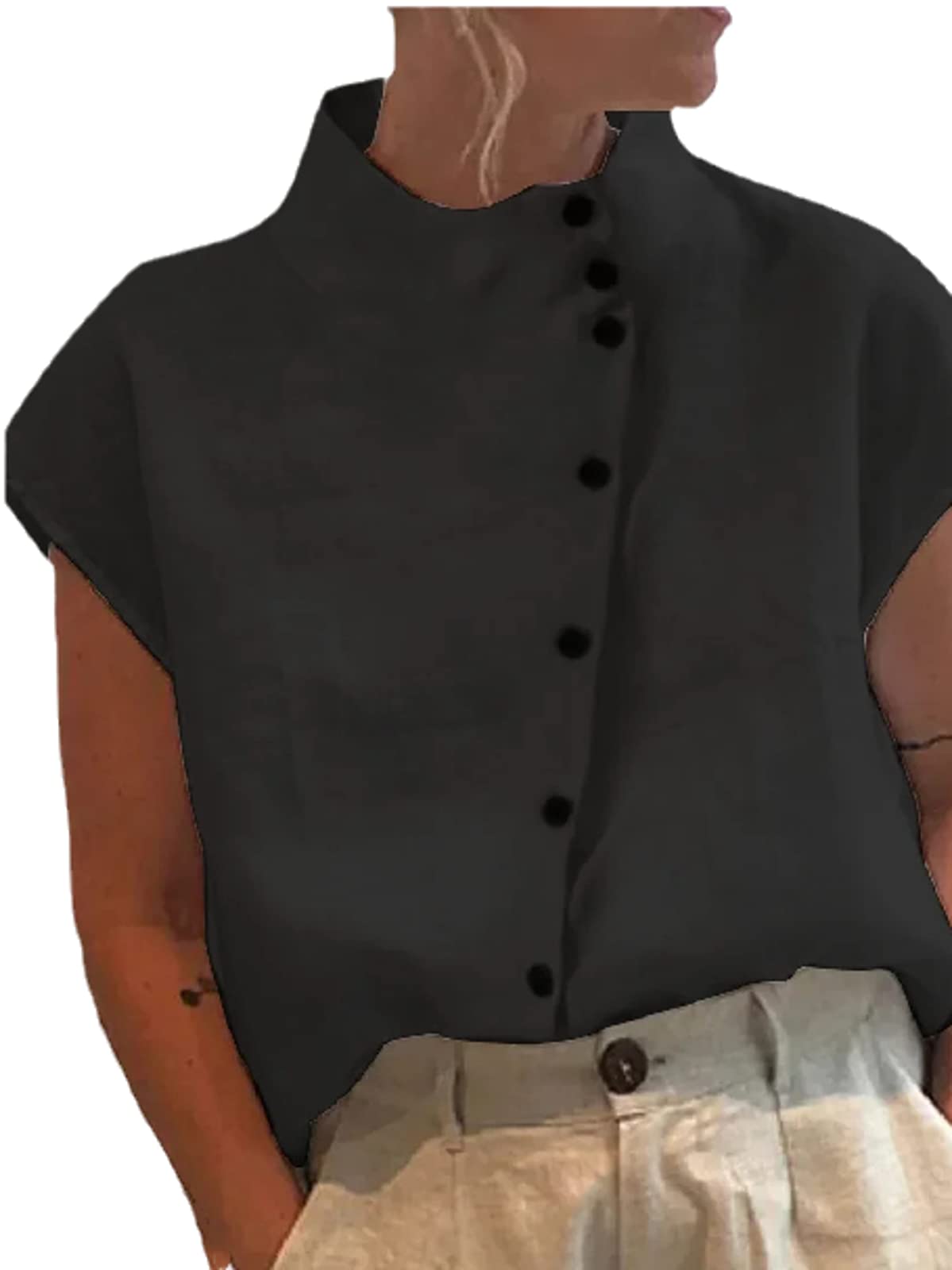 Chahuer Women's Buttonup Cotton Linen Shirt with Stand Collar Casual Loose Comfortable Short Sleeve Blouse Black L