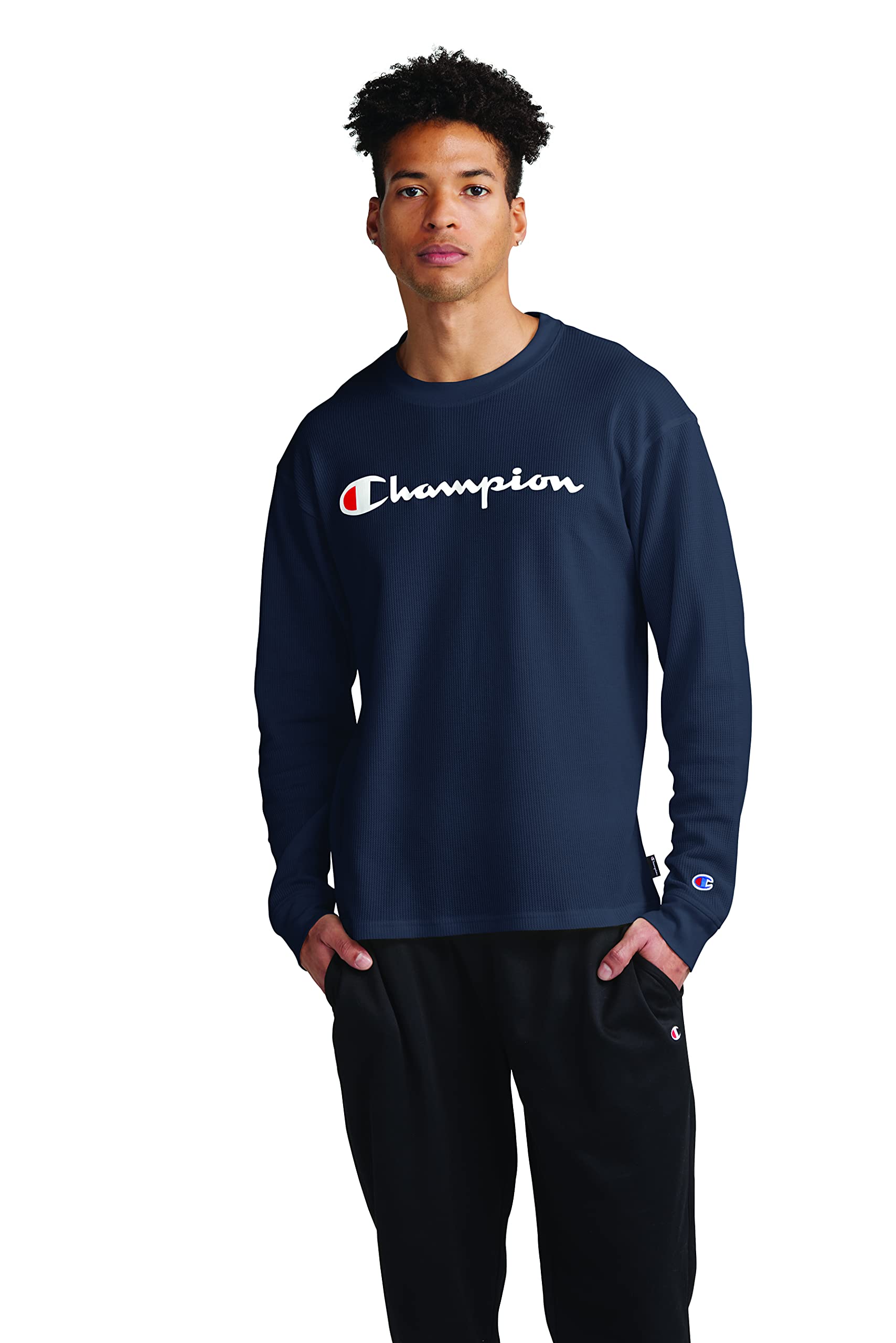 DescriptionA versatile tee for warmer temperatures, this Champion® waffle knit shirt makes the perfect layering piece. Crafted from a strong polyester-cotton blend, this men’s long-sleeve tee provides warmth without weighing you down. Detailed with ribbed trim, this men’s waffle knit tee is perfect for any activity. The sporty waffle knit design is accented with a Champion® screen print and an iconic logo patch. This casual-cool style is something you'll want to wear again and again.