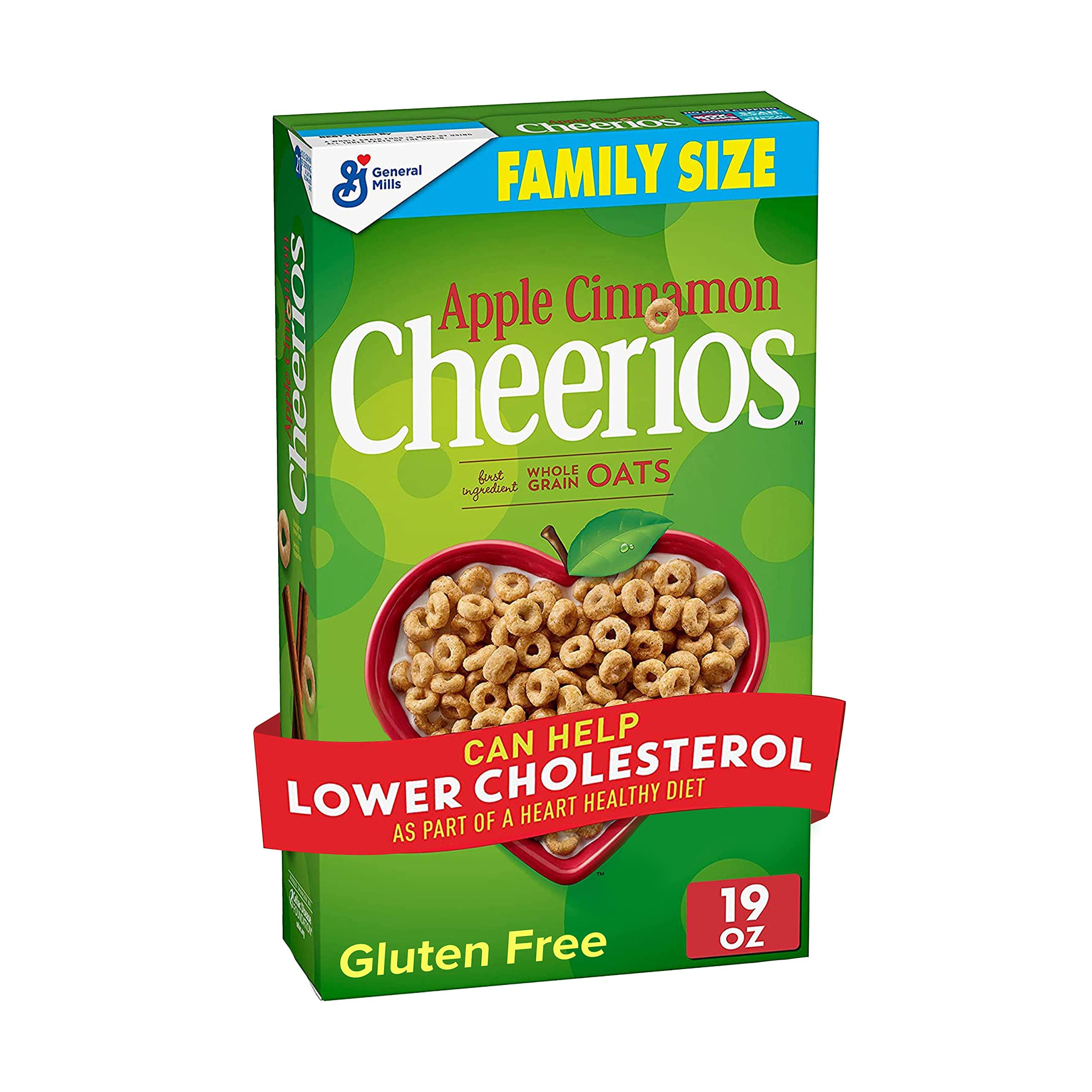 Taste the wholesome goodness of apples and cinnamon in every bowl of General Mills Apple Cinnamon Cheerios Heart Healthy Cereal. A family favorite on the breakfast table, these toasted Os are made with whole grain oats, plus apple puree and a generous sprinkle of cinnamon. Kids love the delicious flavor combination, and you can appreciate that each little O is made simply with no artificial flavors or colors. The toasted oat cereal also makes great snacks for toddlers to practice feeding themselves. Every serving provides 12 essential vitamins and minerals, along with 21 grams of whole grain. Apple Cinnamon Cheerios can help lower cholesterol as part of a heart healthy diet. Three grams of soluble fiber daily from whole grain oat foods in a diet low in saturated fat and cholesterol may reduce the risk of heart disease. Apple Cinnamon Cheerios cereal provides 0.75 grams per serving. The breakfast cereal is also a good source of calcium and iron. Make your own special way to start the day by pouring a bowl of cereal for breakfast or packing a serving for on-the-go heart healthy snacks. This 19-ounce family size cereal box is easy to store in your pantry. Whether you're looking for delicious snacks, cereal bars, trail mix ingredients or a breakfast food for the whole family, General Mills cereals spread goodness from tots to grown-ups.