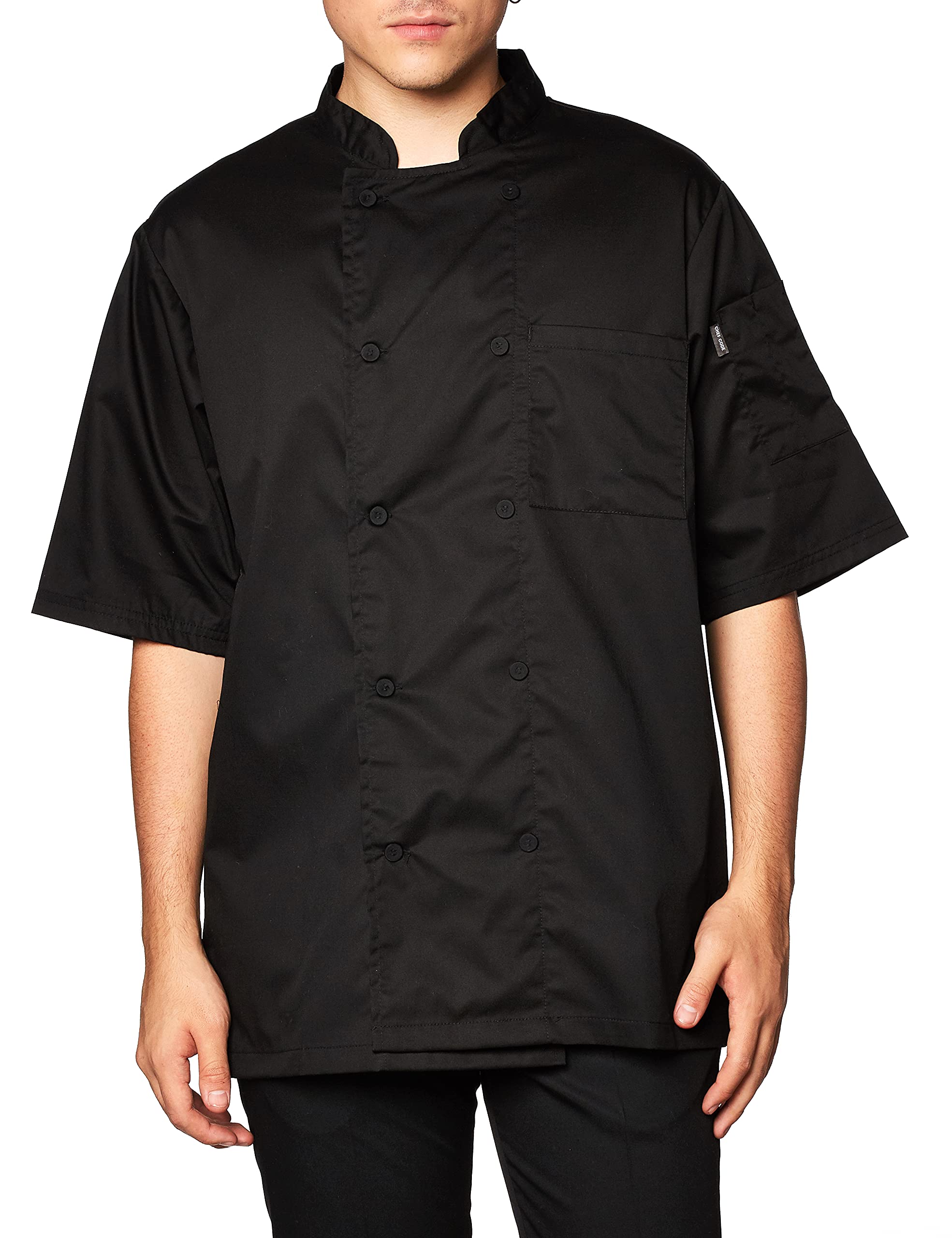 DescriptionFeatures a mesh vent inlay to keep things cool in the kitchen. Double breasted 60/40 cotton-poly made with our award winning ever soft fabric cloth covered buttons, French cuffs, thermometer and left inset pockets. This raglan style coat has a back yoke with drop shoulder for ease and comfort
