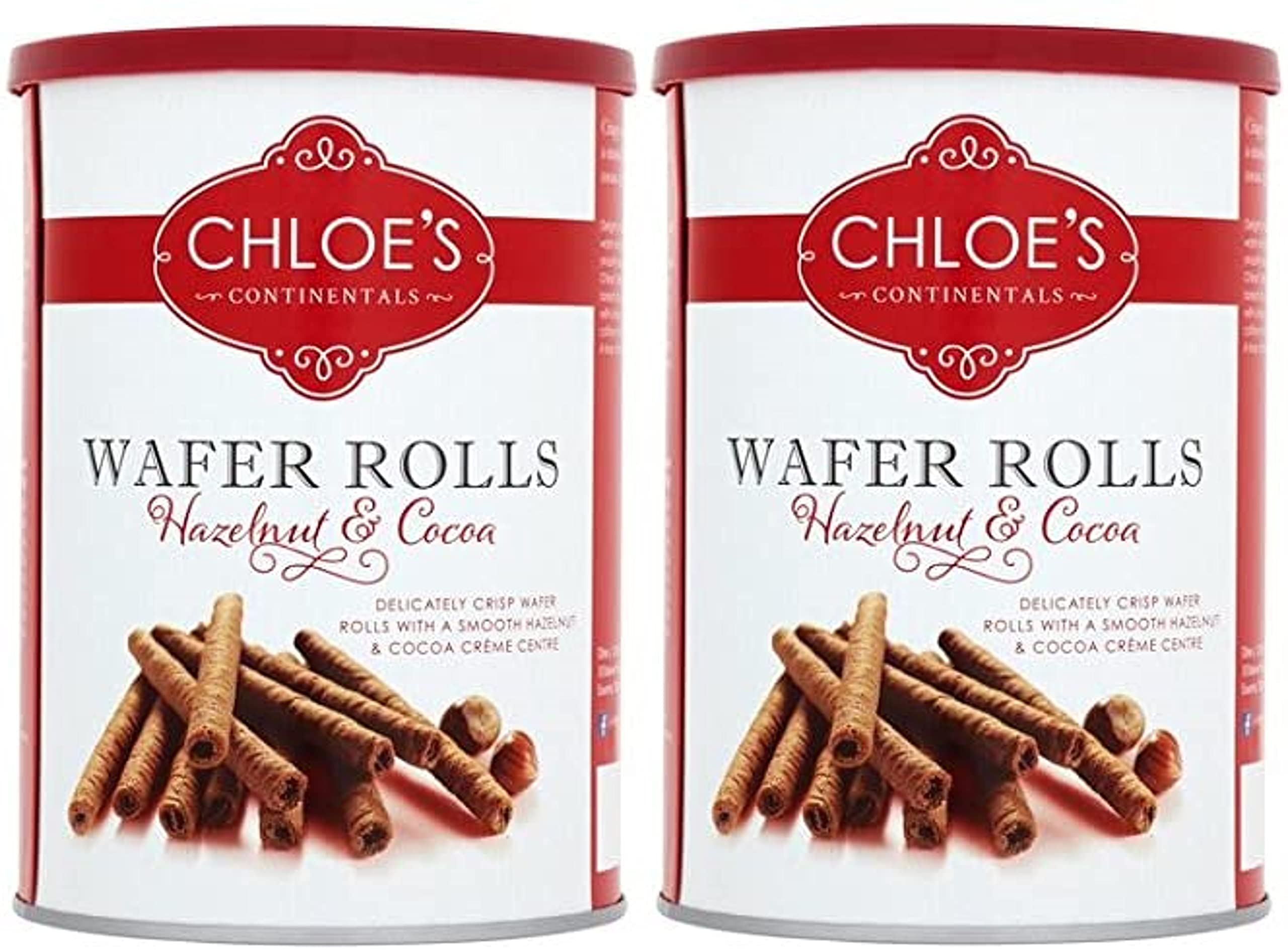DescriptionProduct DescriptionChloe's Hazelnut & Cocoa Wafer Rolls - Pack of 2 X 400G Chloe's Hazelnut and Cocoa Wafer Rolls combine a delicately crisp wafer wrapped around a smooth hazelnut and cocoa crème centre. The light wafers melt in your mouth and are perfect with a mug of hot chocolate, coffee or served on top of your favourite ice cream. and Crispy wafer rolls with a rich and smooth hazelnut and cocoa creme filling, and They are said to be perfect with a mug of hot chocolate and Ideal finishing touch for a dessert or ice cream.IngredientsSugar, Wheat Flour, Palm Oil Whey Powder (Milk), Corn Starch, Fat Reduced Cocoa Powder (3.7%), Skimmed Milk Powder, Hazelnuts (1.2%), Colour: Plain Caramel; Glucose Syrup, Emulsifier: Soya Lecithin; Natural FlavouringsDirectionsSee The Packaging For More InformationSafety WarningSee The Packaging For More InformationManufacturer Contact InformationChloe's, C/O Arden Fine Foods UK Ltd, 10 Banner Park, Wickmans Drive, Coventry, CV4 9XA.
