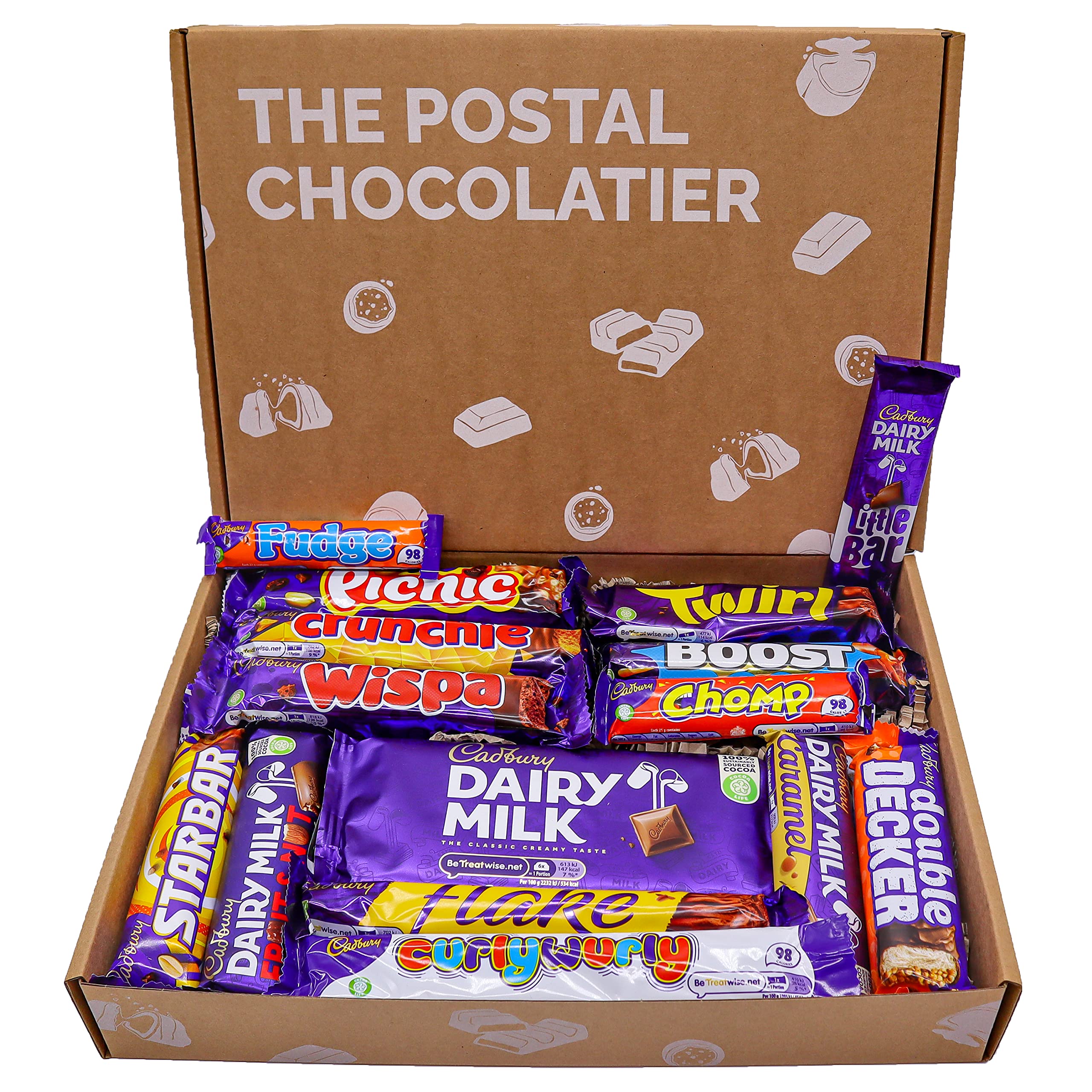The ultimate fun Cadbury Chocolate Hamper comes in a fun box, inside you can find zigzag kraft shred which gives the gift a real "hamper" feeling. It includes: Cadbury Chocolate Hamper, 1x DairyMilk 100g, 1x Picnic, 1x Starbar, 1x Boost, 1x Fudge, 1x Wispa, 1x Chomp, 1x Double Decker, 1x DairyMilk Fruit n Nut, 1x Flake, 1x Crunchie, 1x CurlyWurly, 1x DairyMilk Caramel, 1x Twirl, 1x Dairy Milk Little Bar