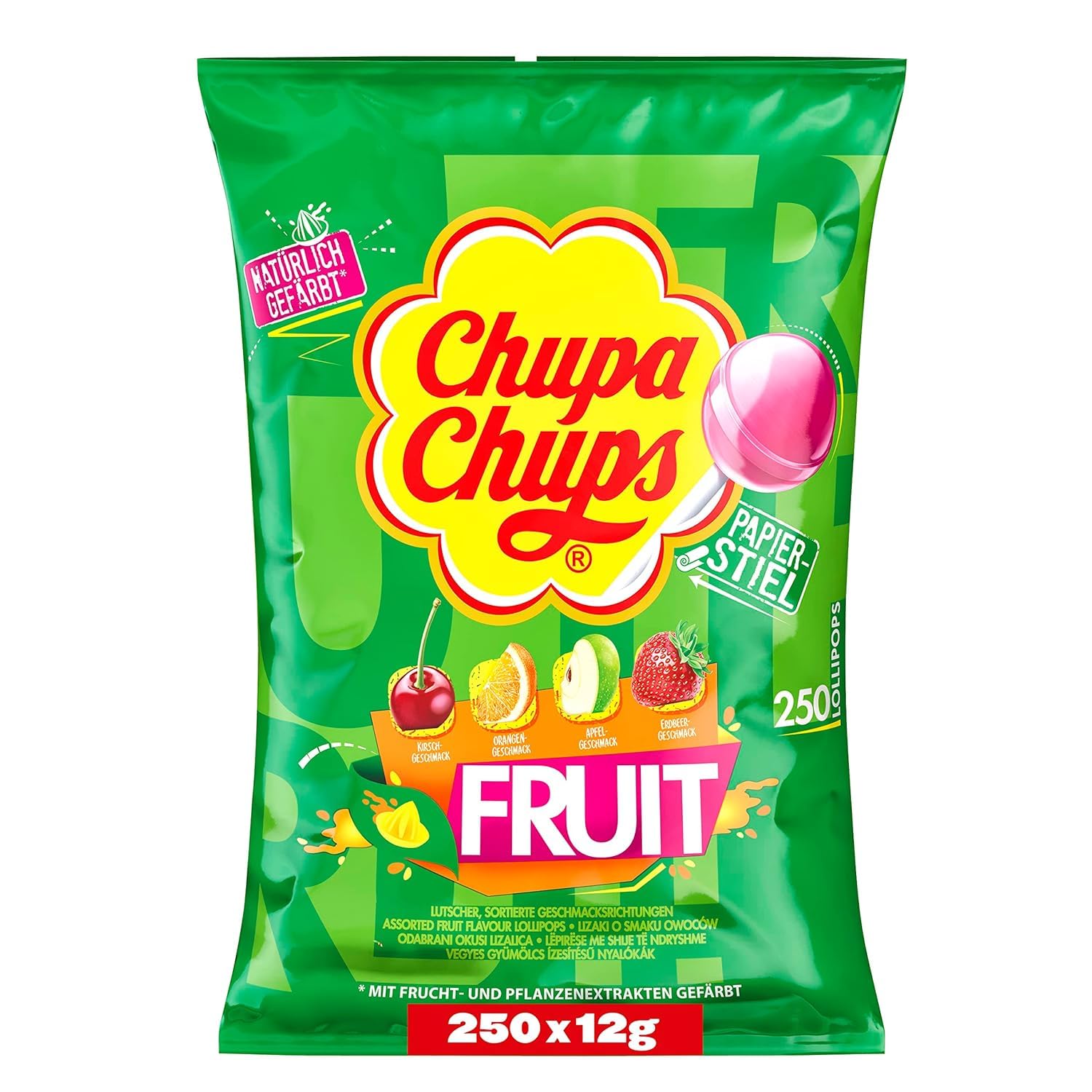 DescriptionProduct DescriptionCHUPA CHUPS FRUIT: 250 refill bags in 4 delicious flavours.Unparalleled fruit enjoyment on the stem in the varieties apple, strawberry, orange and cherry:Since 1958, the cult lollipops have been delighting adults and children alike and offer a huge selection of various flavours and creations. The 250 fruit lollipops in a practical refill bag make you want more and ensure the irresistibly sweet sucking pleasure in between. Whether for personal needs or for sharing at parties or office - thanks to the economy pack you have your favourite variety of Lollis always at hand.SNACKING WITH STYLE:The delicious companions are individually packaged and can be easily removed. At home, on the go, as a supply or on a break - the lollis are suitable for small snack enjoyment. The extra large bag offers delicious variety and therefore everything the heart desires. So there is something for every taste. Peep. Access Treat it! See for yourself and let yourself be carried away by the fruity intense taste explosion.Advantages:• EXTRA FRUITY: The bag contains the fruity delicacies of the cult lollipop.• XXL pack: Due to the useful refill bag, you always have the optimal supply at hand.• Quality: Chupa Chups Lollipops convince in all their variations with their intense taste.Notes:• Please always store in a cool and dry place.• The product does not replace a balanced and healthy diet.If there are any problems with one of our products, we ask you to contact our customer service at info@cfp-brands.de so that we can find a solution together.IngredientsIngredients: sugar, glucose syrup, fruit pulp (apple, cherry, raspberry, orange, pineapple, lime, lemon, banana, strawberry, peach, blueberry, blackberry, mango, watermelon, kiwi) (3%), acidifier (lactic acid, apple acid, citric acid), flavouring, dyes (turmeric, capsanthine, beet).