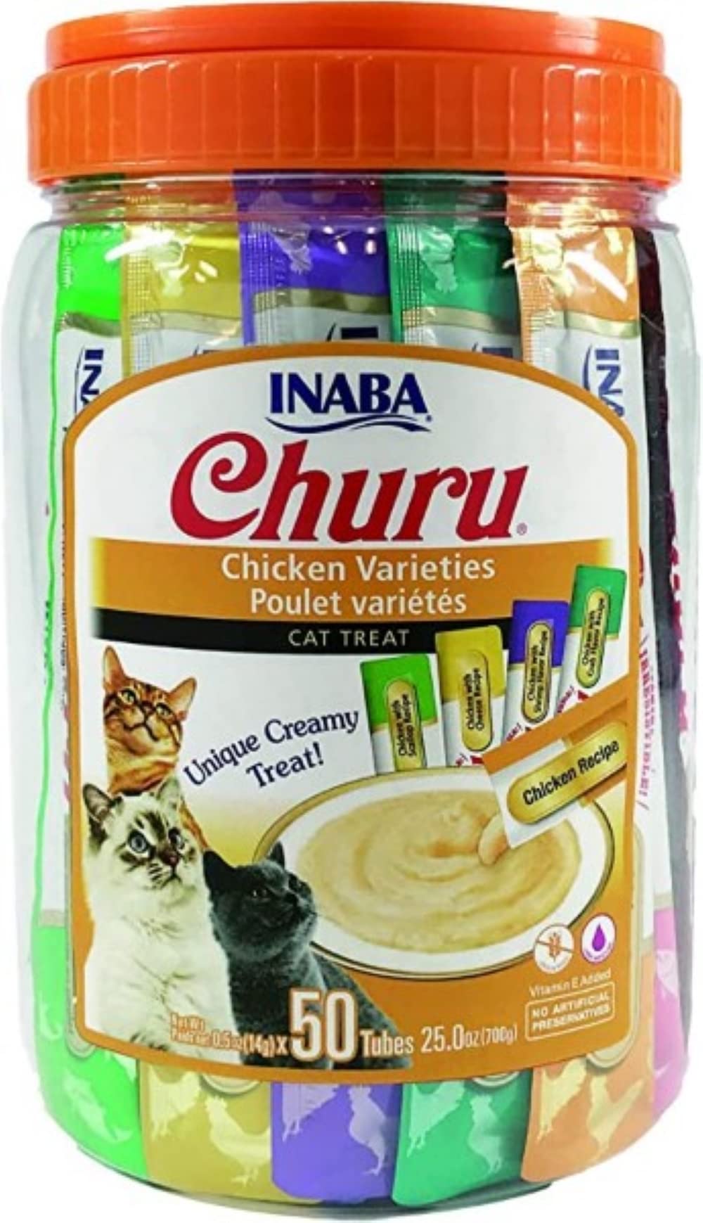 Product DescriptionINABA Churu Cat Treats, Grain-Free, Lickable, Squeezable Creamy Purée Cat Treat/Topper with Vitamin E & Taurine, 0.5 Ounces Each Tube, 50 Tubes, Chicken VarietyIngredientsLimited-IngredientsDirectionsFeed as a treat, see pack for directions.