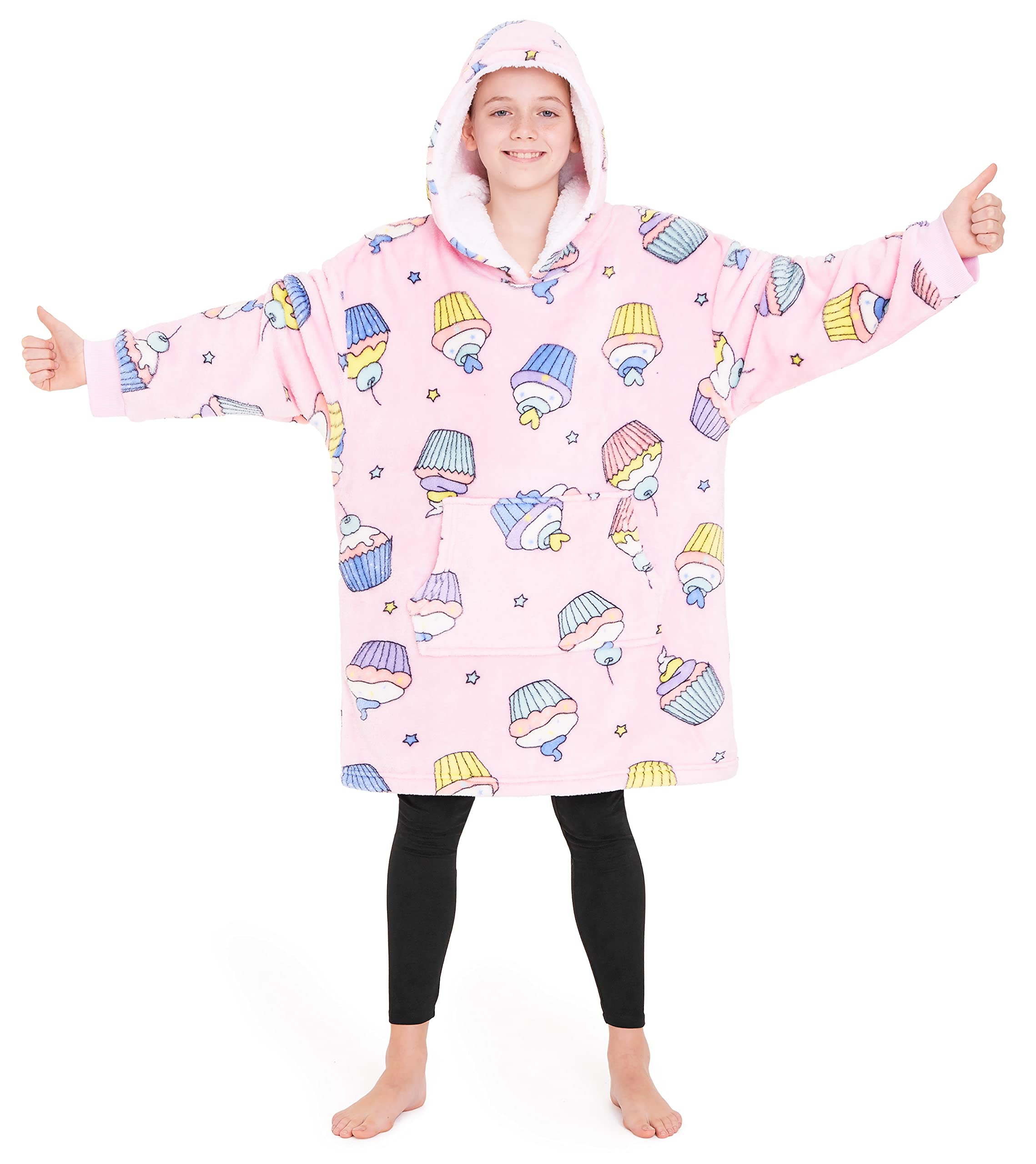 Kids blanket hoodie with long sleeves, a kangaroo pocket and fun selection of colours and designs: