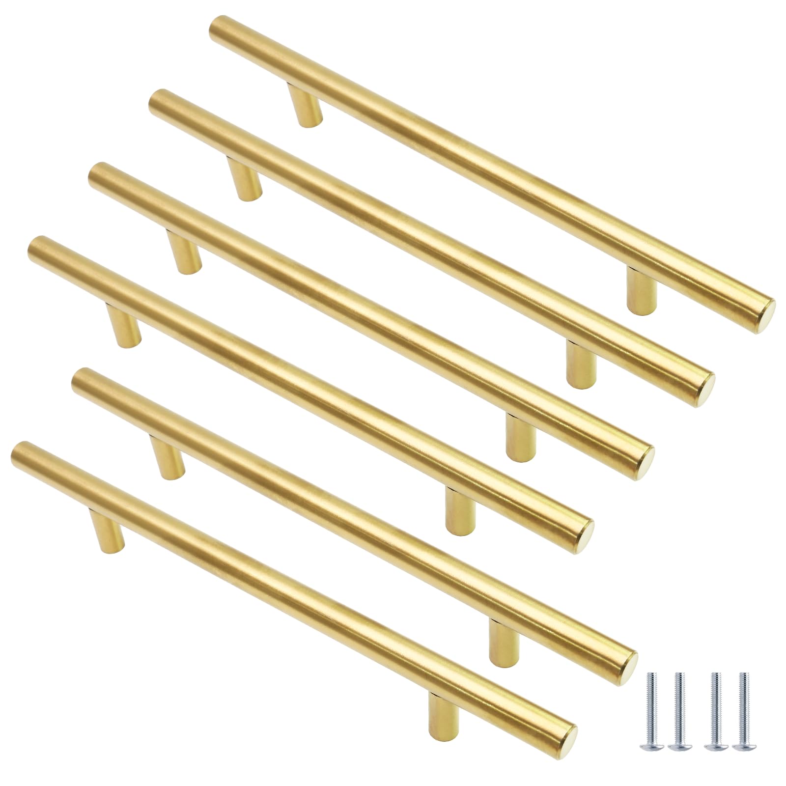 Cjueiom 6 Pack Gold Cupboard Handles 160mm Hole Center T Bar Handles, Stainless Steel Drawer Handles Long Wardrobe Door Handles Pulls, 250mm Length Kitchen Cabinet Handles for Bedroom Drawer