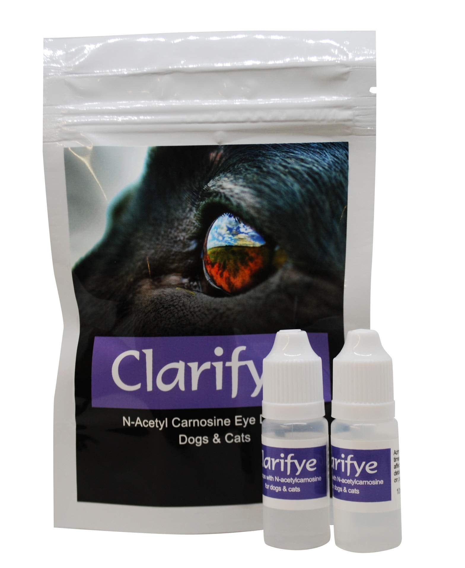 Clarifye eye drops are used to keep your dog’s eyes healthy. The anti-oxidants in Clarifye help reduce damage to the proteins in the lens - keeping the lens clear While there are many diseases that affect dog’s eyes, the most common long term problem is cataracts. They can be hereditary or created by lifestyle and diet. Diabetes is a common cause Clarifye is for Dogs and Cats only - do not use on other species You can use Clarifye on any age of dog, in a single eye that you feel needs support or on both eyes Trustpilot rated 5 Star - see more reviews below “The eye drops Clarifye have stopped the development of cataracts in both of my Border Collies eyes” Mr J Hall, Trustpilot Reviews, January 2020 Directions for Use Suitable for both dogs and cats. Apply 1 drop in affected eyes 4 times a day. Continue application for at least 90 days for best results. A full course may need to be 6-9 months. Reduce the application to once per day when you feel that your dog’s eye health is satisfactory. Take care not to touch the bottle tip to any surface or to the eye(s) when applying the eye drops -keep it sterile. Do not use Clarifye if your pet is using steroid eye drops as they would neutralise the Clarifye and it would not offer any benefit. Drops come in a 10ml bottle with a dropper dispensing system. Once opened keep re-sealed and cool and discard after 60 days. A 10ml bottle will give over 200 drops enough for both eyes for over a month. If you receive your product in damaged packaging please return it to us rather than using it. Safety is our number one concern when it comes to eye support It is safe for your pet to ingest and lick. Many diabetic dogs have eye problems and Clarifye is safe to use with diabetic dogs