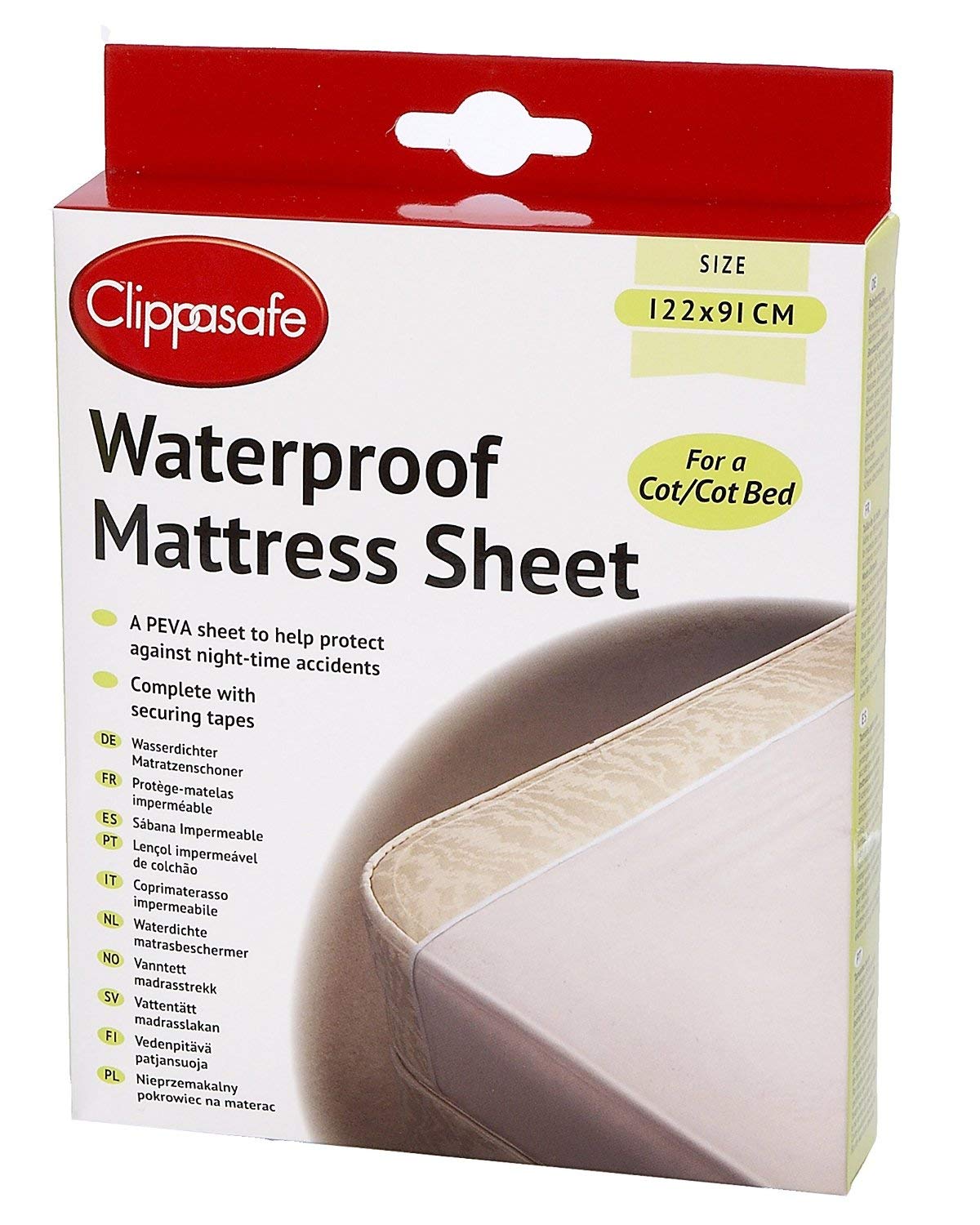 Product DescriptionClippasafe waterproof mattress sheets protect the mattress from little accidents and help you to clean up quickly and efficiently, minimising the time taken to get little ones back into bed and soundly off to sleep again. made from peva, and measuring 122 x 91cm this will fit a cot or cot bed and help to keep the mattress dry and undamaged as no moisture can filter through. simply place on the mattress with the fitted sheet over the top. also available in single bed size.Box ContainsWaterproof Mattress Sheet for a Cot or Cot Bed