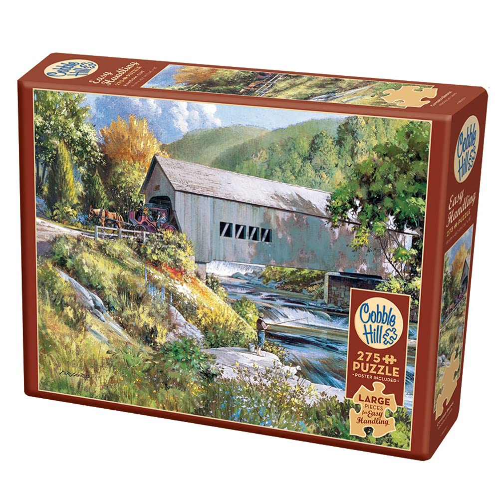 The horse carriage emerging from the Covered Bridge draws the attention of the man fishing off the rocks by the small cascading waterfalls down the rock steps. Cobble Hill's Easy Handling 275 piece puzzles have extra large random cut pieces to make gripping the pieces easier and the reference poster will help you find your way through the adventure.