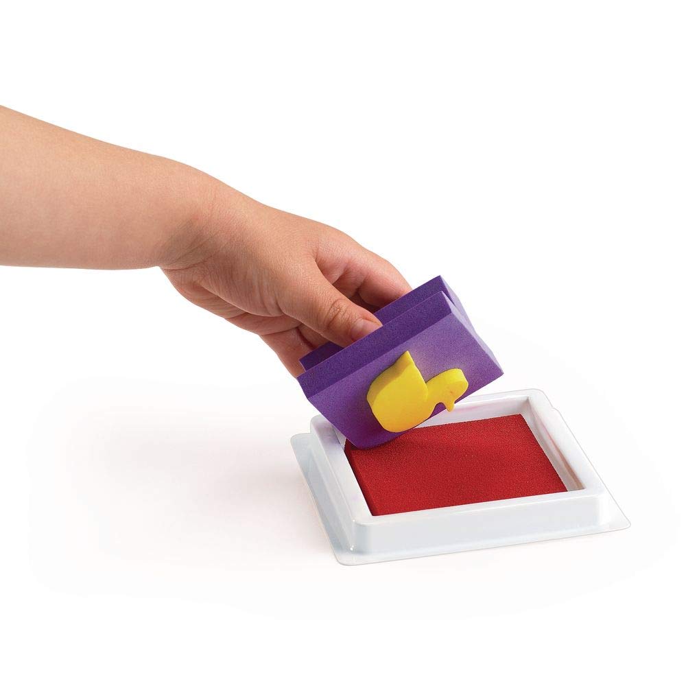 Incredible set is complete with 20 uniquely designed Jumbo stampers and 16 washable stamp pads. (Includes gold and silver stamp pads to make Shiny and special designs; stamper designs include: square, star, Duck, tulip, cat, triangle, butterfly, circle, heart, dog, tree, daisy, car, house, Teddy bear, fish, sun, Airplane, leaf and Dinosaur; stampers can be cleaned with mild soap and water mixture; stamp pads come in 2 each of 8 colors: Blue, gold, green, Purple, orange, red, silver and yellow; stamp pads measure 3-3/4"sq. , stampers measure: 2-1/2 inch L x 2-1/8 inch W x 1-1/4"H; washable, non-toxic ink) - discount school supply item # STAMPACK.