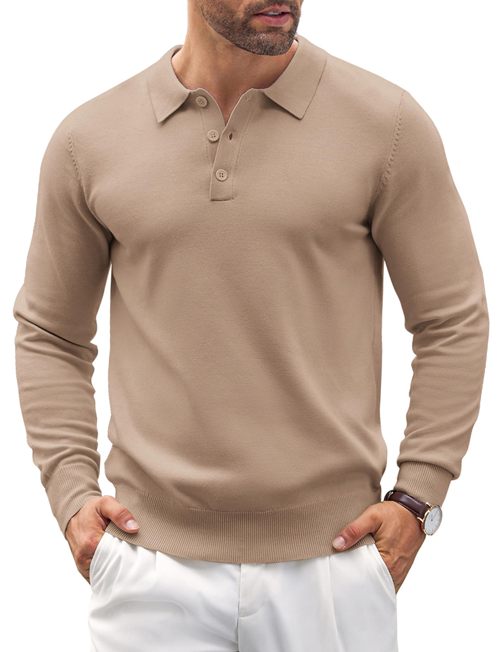 COOFANDY Men's Long Sleeve Polo Shirt Casual Knit Button Down Golf Shirt Khaki