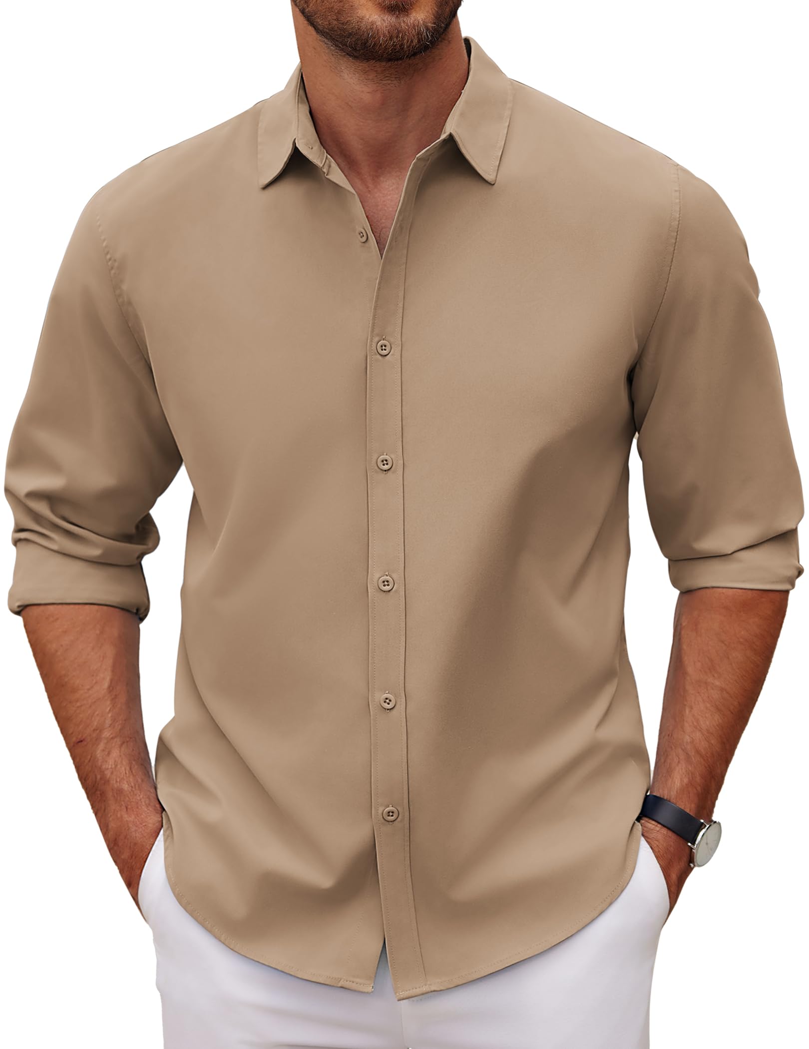 COOFANDY Men's Summer Business Casual Button Down Shirt Business Formal Long Sleeve Athletic Fit Lightweight Shirt Khaki