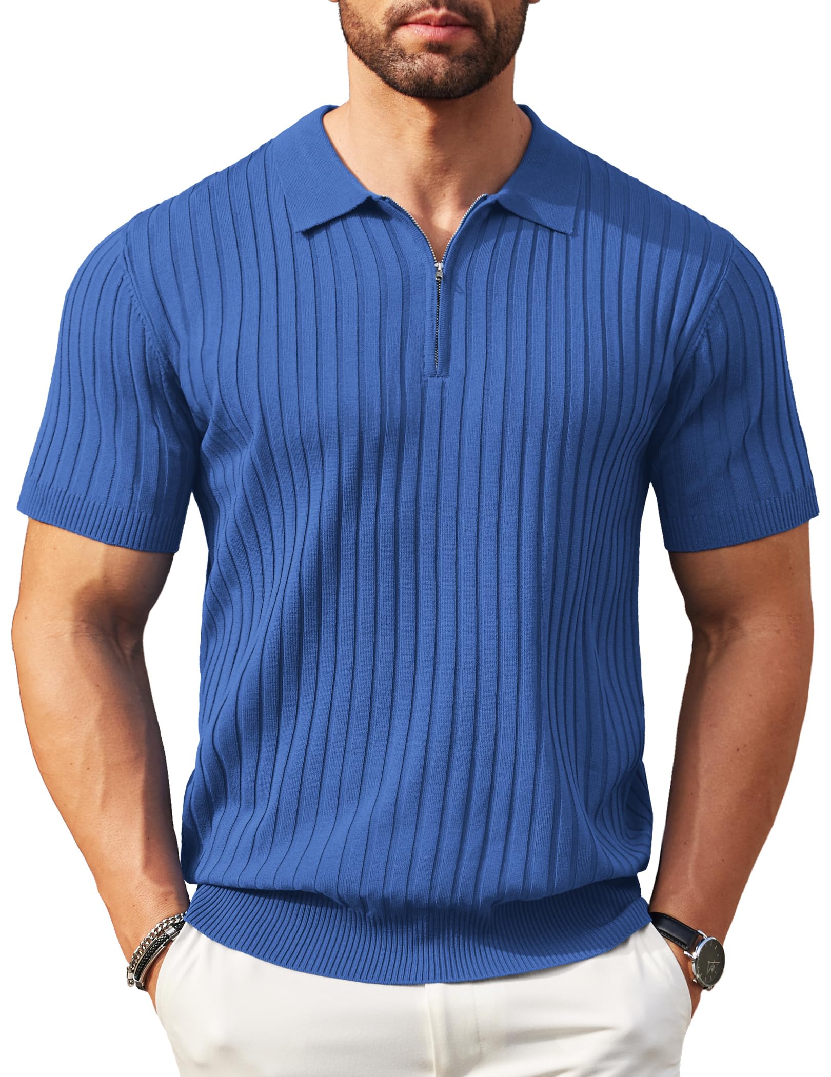 COOFANDY Men's Zipper Polo Shirts Short Sleeve Ribbed Knit Polo T Shirts Fashion Casual Golf Shirts Blue