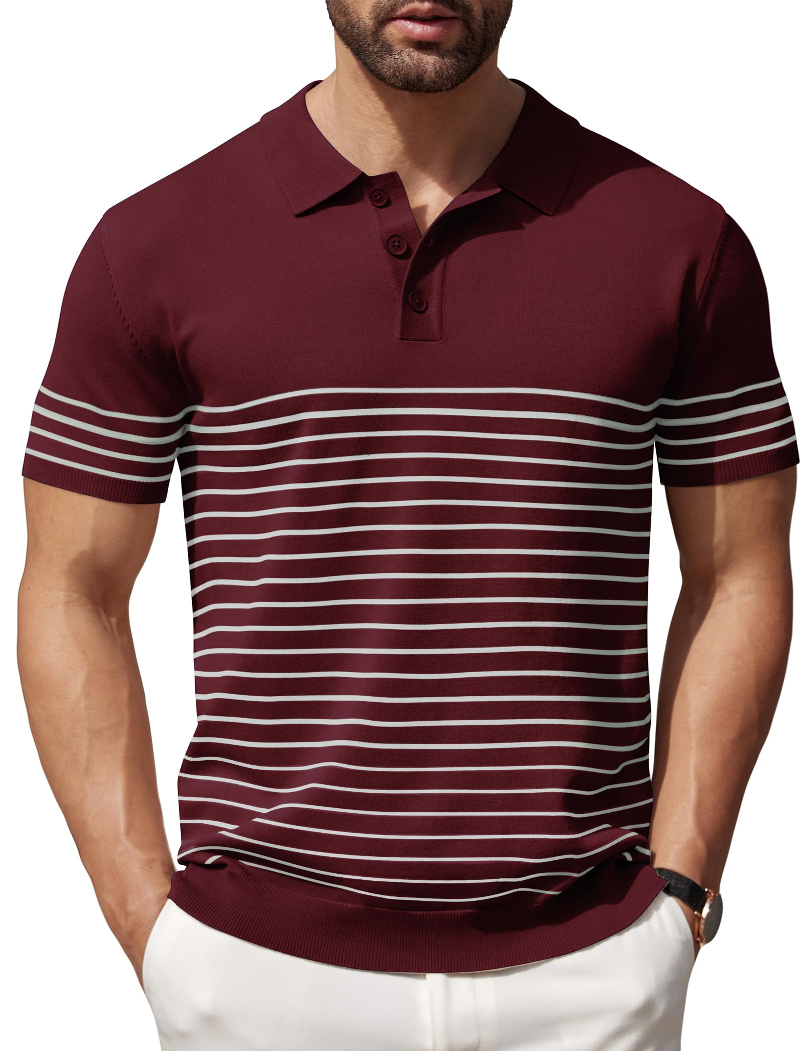 COOFANDY Mens Short Sleeve Polo Shirt Striped Knit Polo T Shirt Lightweight Classic Fit Shirts, Wine Red, XX-Large