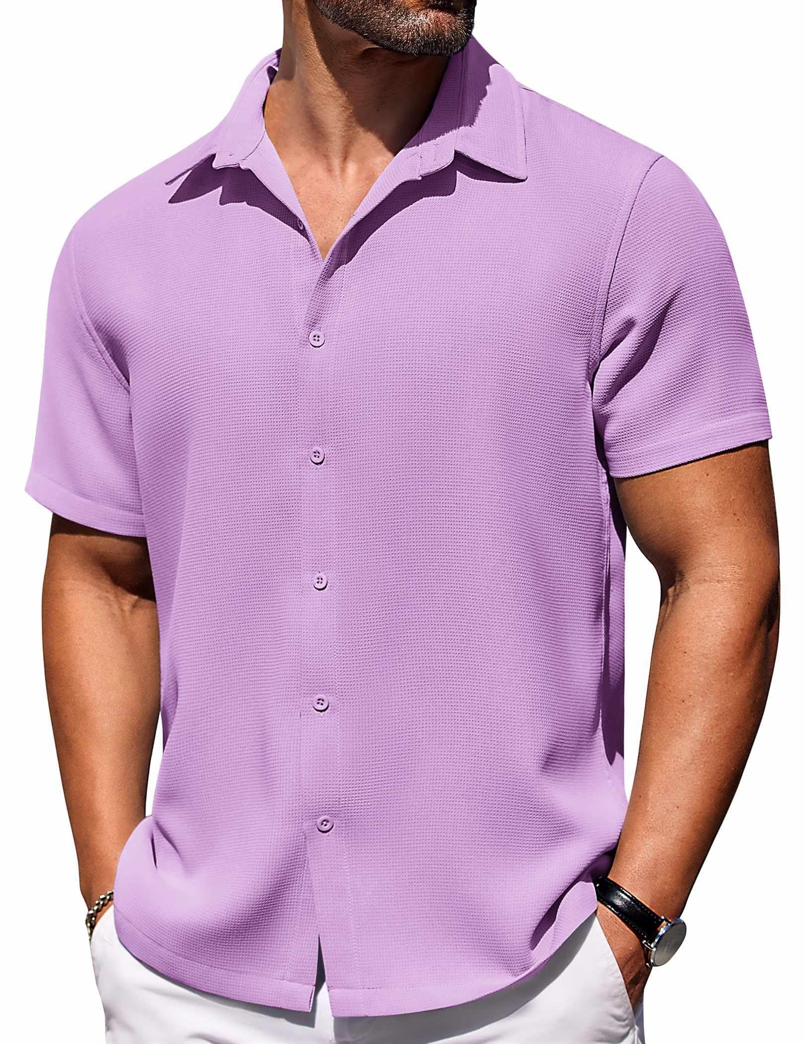 COOFANDY Mens Summer Short Sleeve Shirts Casual Button Down Slim Fit Shirt Textured Waffle Shirt Light Purple