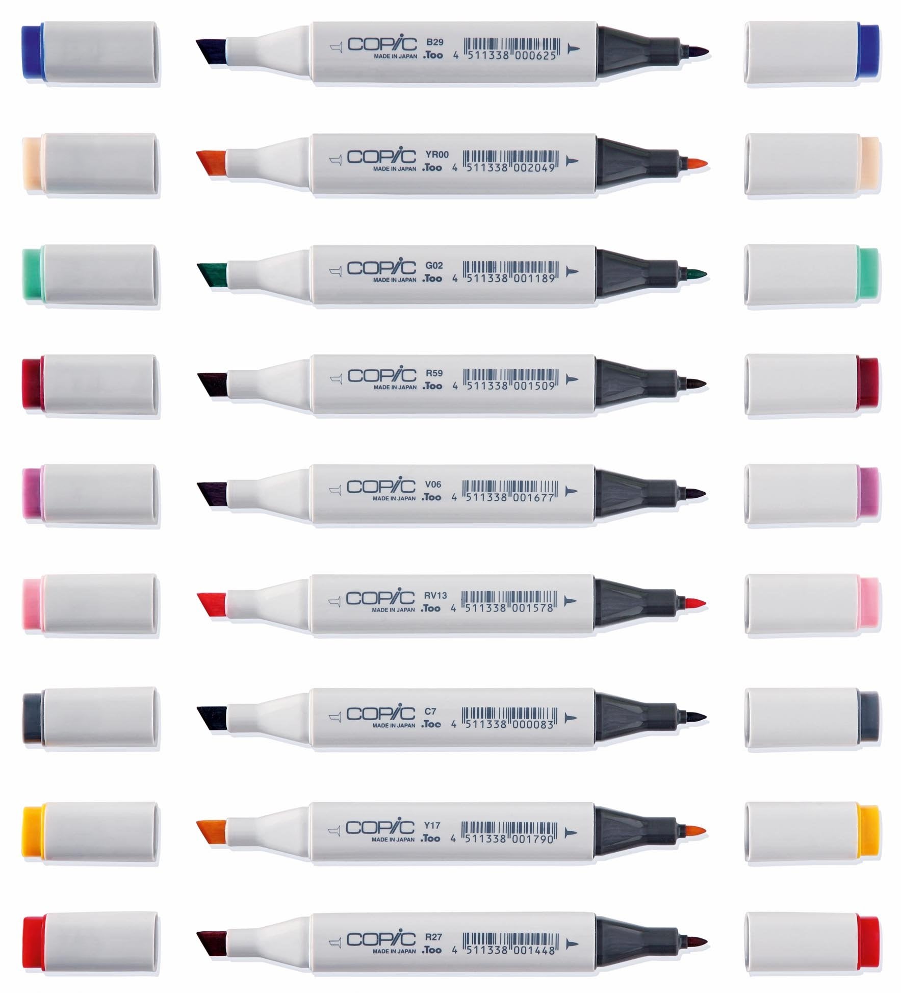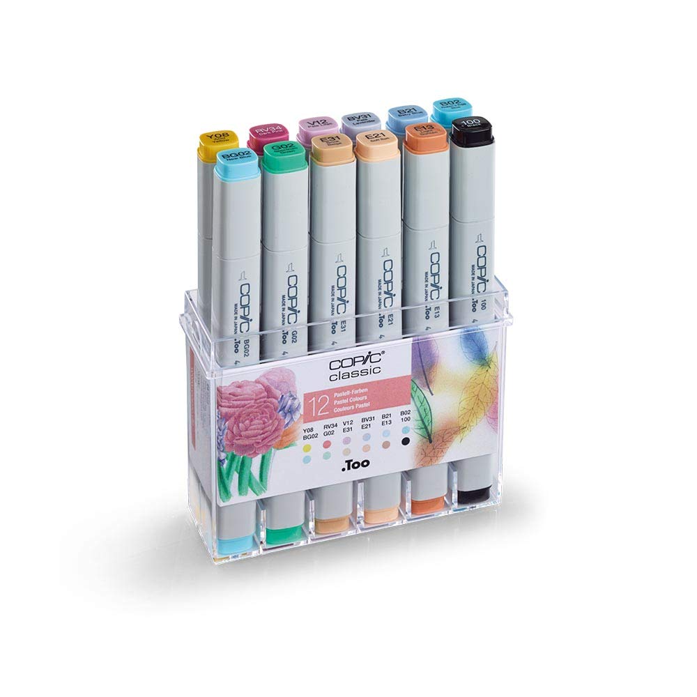 Experienced design experts developed ten special COPIC sets on various topics. | With only 12 colours 11 colours plus black can be prepared specific themed areas completely. | The purchase of sets is a good way to build up its own colour palette of COPIC colours continuously. Set of 12 pastel colors B02 B21 BG02 BV31 G02 E13 E21 E31 RV34 V12 Y08 100 | Brand : Copic