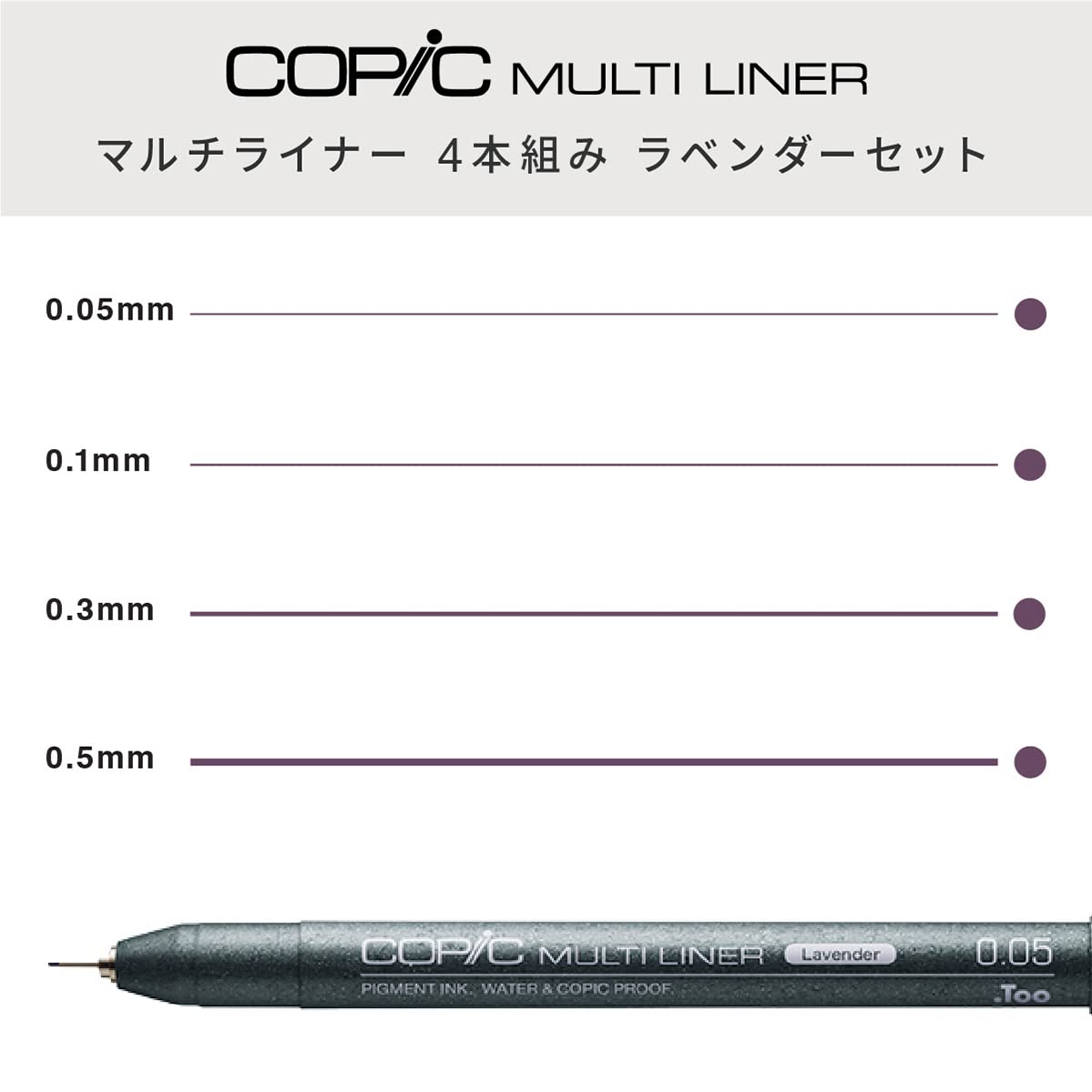 This package contains four Copic Multiliner lavender ink pens with the nib sizes 0.05, 0.1, 0.3 and 0.5mm | Water based pigment ink (becomes waterproof when dry) | Multiliner pen has pigment-based ink and is Copic-proof, meaning that once the ink has dried, it won't bleed into the Copic markers.