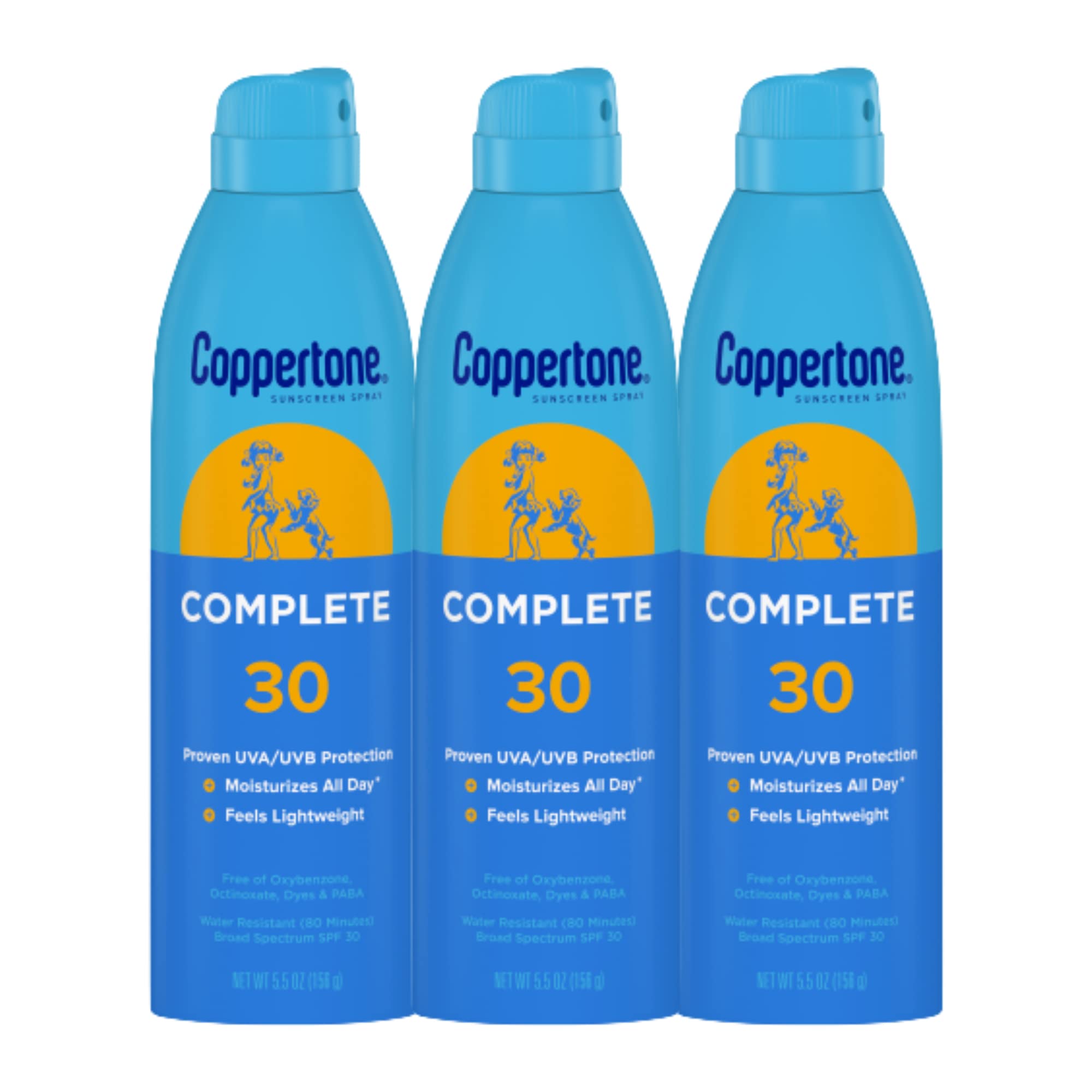 Coppertone COMPLETE SPF 30 Sunscreen Spray, Lightweight, Moisturizing Sunscreen Pack, Water Resistant Spray Sunscreen SPF 30, 5.5 Oz Spray, Pack of 3