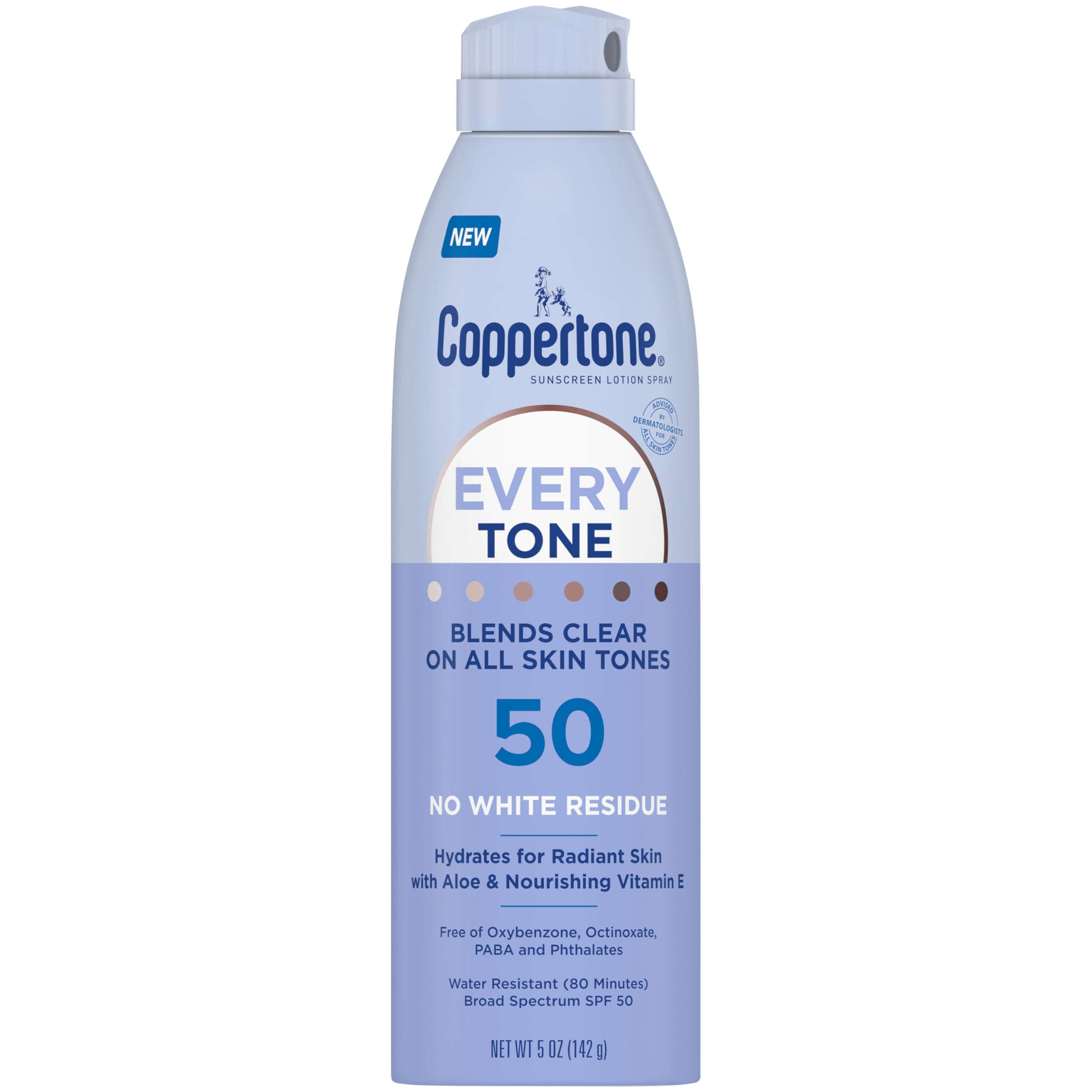Enjoy trusted sun protection without the white cast with Coppertone Every Tone Sunscreen Spray SPF 50. Formulated to blend in clear on all skin tones, this SPF 50 sunscreen spray leaves behind no white residue. It offers a water-resistant formula (80 minutes) with Broad Spectrum UVA/UVB protection and stops up to 98% of damaging UV rays. Coppertone Every Tone Sunscreen Spray is a moisturizing spray sunscreen with a lightweight formula that comes in a convenient spray format and dries quickly. Formulated with nourishing Vitamin E, skin is left feeling soft and moisturized. This non-greasy, fragrance free sunscreen spray is also free of oxybenzone, octinoxate, PABA and phthalates. Coppertone Every Tone Sunscreen Spray is advised by dermatologists for all skin tones. Each sunscreen Coppertone creates follows a tradition of trusted, quality sun protection products. Coppertone has been providing innovation for more than 75 years, and was voted the most trusted sunscreen brand.(1) Use and reapply this spray on sunscreen SPF 50 as directed.(1)Voted Most Trusted Sunscreen Brand by American Shoppers Based on the 2022 BrandSpark American Trust Study-Multi Year Winner.