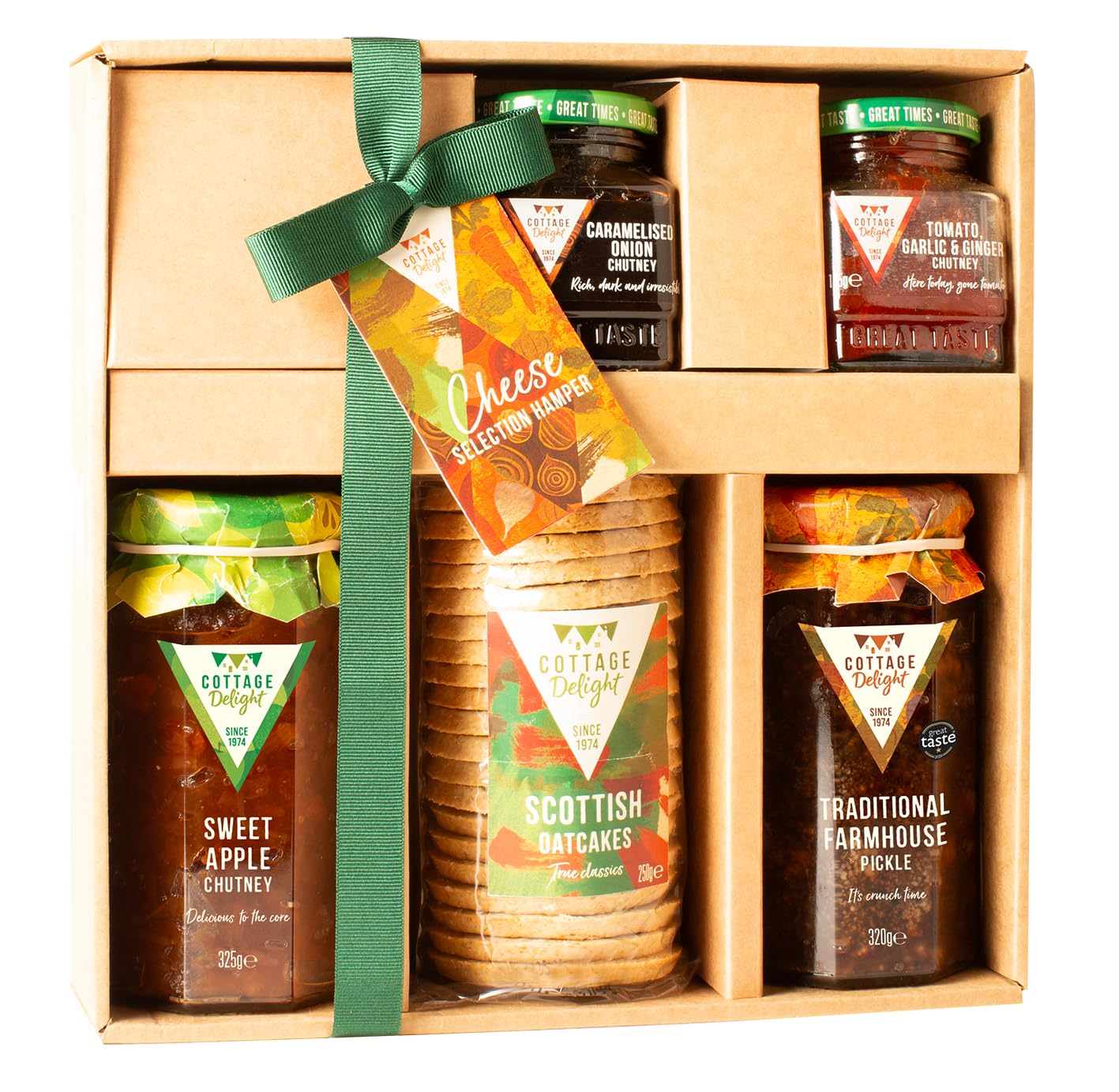 Sweet Apple Chutney - Bramley apple (30%), Sugar, Cider vinegar, Gelling agent: Fruit pectin, Muscovado sugar, Sultanas, Dried onion flakes, Salt, Spices, Acidity regulator: Citric acid. Caramelised Onion Chutney - Onion (51%), Sugar, Balsamic vinegar (Wine vinegar, Grape must, Colour: SULPHITE ammonia caramel, Preservative: SULPHUR DIOXIDE), Muscovado sugar, Sunflower oil, Spices, Concentrated lemon juice, Garlic powder, Acidity regulator: Citric acid, Salt. Tomato, Garlic & Ginger Chutney - Tomato (37%), Demerara sugar, Concentrated tomato purée, Bramley apple, Cider vinegar, Dried onion flakes, Sultanas, Garlic (2%), Stem ginger (1%), Salt, Gelling agent: Fruit pectin, Spices, Garlic powder, MUSTARD flour. Classic Cheese Board Chutney - Cheese Board Chutney with Apples, Raisins and Walnuts. Bramley apple (40%), Sugar, Cider vinegar, Raisins (5%), WALNUTS (3%), Gelling agent: Fruit pectin, Stem ginger, Salt, Ground ginger. Classic Cheese Maker's Pickle - Demerara sugar, Cider vinegar, Carrots, Onions, Rhubarb (10%), Golden syrup, Blackberries (7%), Plums (7%), Blackcurrants (7%), Worcestershire sauce (Water, Spirit vinegar, Sugar, Onion, Salt, Tamarind paste, Ginger, Garlic, BARLEY malt extract, Cloves), Concentrated tomato purée, Spices. Scottish Oatcakes - OATMEAL (63%), Vegetable oils (Palm, Rapeseed), WHEAT flour (Contains Calcium carbonate, Iron, Niacin, Thiamin), Sugar, Salt, Raising agents: Disodium dihydrogen diphosphate; Sodium bicarbonate.