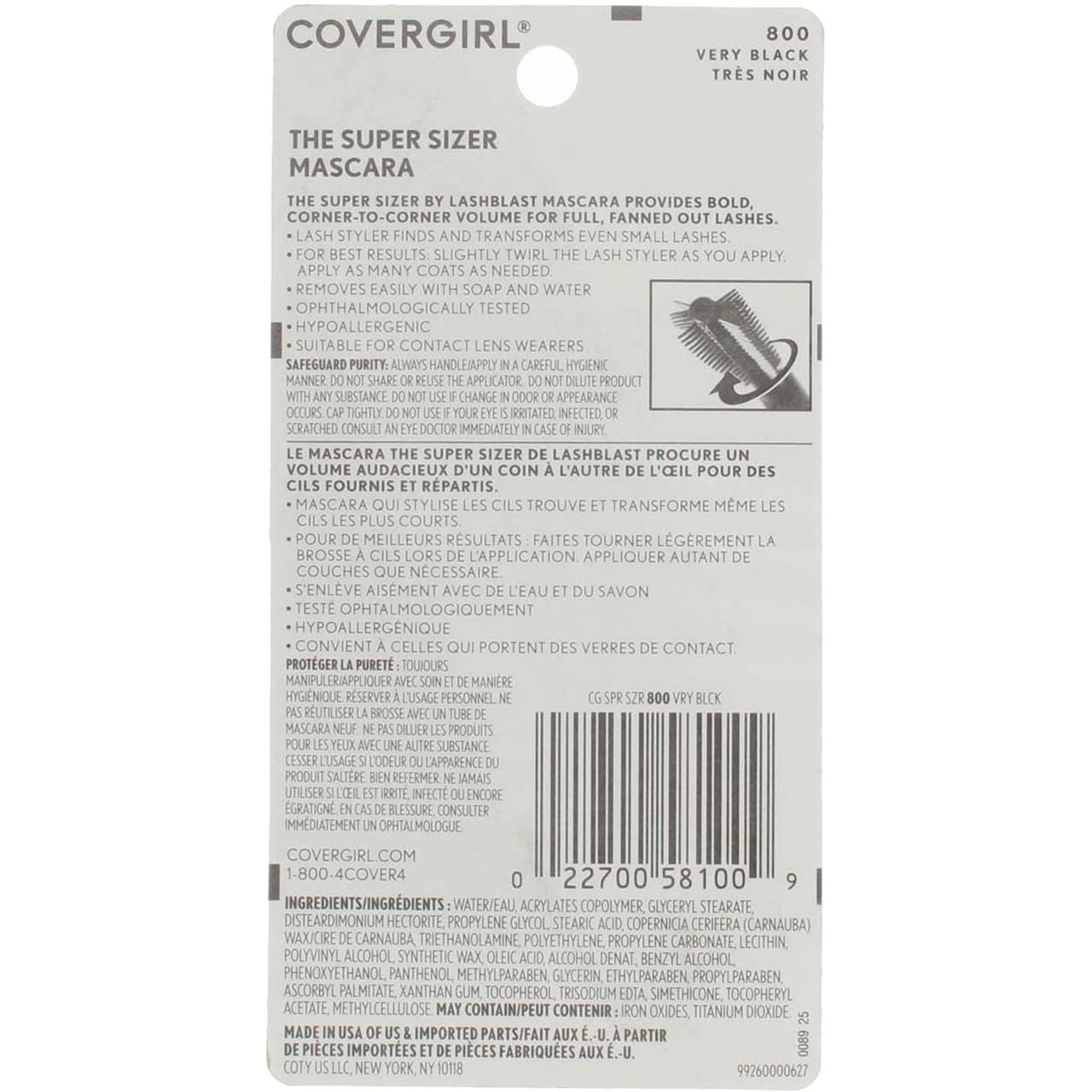 Amp up the drama of your lashes with COVERGIRL SuperSizer Volumizing Mascara by LashBlast. Instantly get dramatic, 400% more corner-to-corner volume for full, fanned out lashes. The unique wand finds and transforms even small lashes. Use the wand's flat side to maximize your volume and the comb side to define and separate, twirling as you apply, for an instant false lash look. This mascara is also hypoallergenic and ophthalmologically tested, so it's suitable for contact lens wearers.