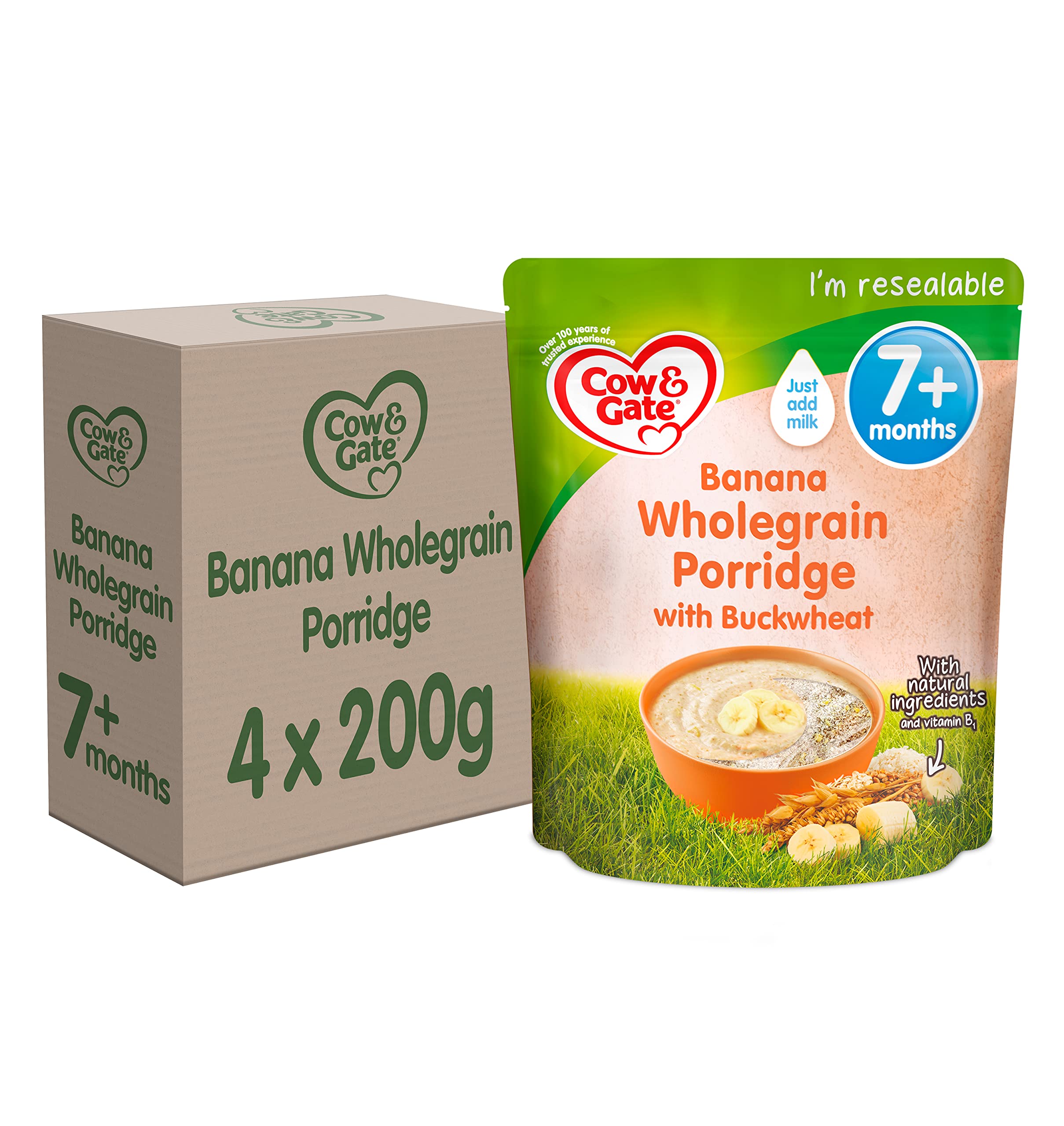DescriptionProduct DescriptionFor our 7 months onwards Wholegrain Banana Porridge we use our best quality natural ingredients**, the blend of milled cereals with banana flakes, corn flakes and added vitamin B1 is grown by farmers we know and trust. We carefully combine a variety of grains, such as buckwheat, oat and millet, with real banana flakes for a delicious recipe tailored to your little one, so they can explore a new taste and exciting texture.**and vitamin B1.IngredientsMilled Cereals (83%) (Wholegrain WHEAT (73%), Buckwheat (1.7%), Wholegrain OAT (1.7%), Wholegrain SPELT (1.7%), Wholegrain Millet (1.7%), Rice (1.7%), RYE), Banana Flakes (12%), Corn Flakes, Vitamin B1DirectionsYummy porridge in 3 easy steps. 1) For every 1 level spoonful of cereal. 2) Mix 3 spoonfuls of your baby's usual milk. 3) Stir and enjoy! Tips: Preparation instructions are a ratio guide only. Let your little one's appetite lead the way. Carefully observe your baby; they will let you know when they have had enough. Add more or less liquid to alter the consistency. Use a clean bowl and feeding spoon. Always check the temperature before feeding.Safety WarningDo not leave your little one alone when eating and drinking. For good dental hygiene, clean your baby's teeth regularly, especially before bedtime.Manufacturer Contact InformationNutricia Ltd, White Horse Business Park, Trowbridge, Wiltshire, BA14 0XQ. UK 0800 996 1000 www.aptaclub.co.uk Nutricia Ireland, Block 1, Deansgrange Business Park, Deansgrange, Co. Dublin. ROI 1 800 22 12 34 www.aptaclub.ie