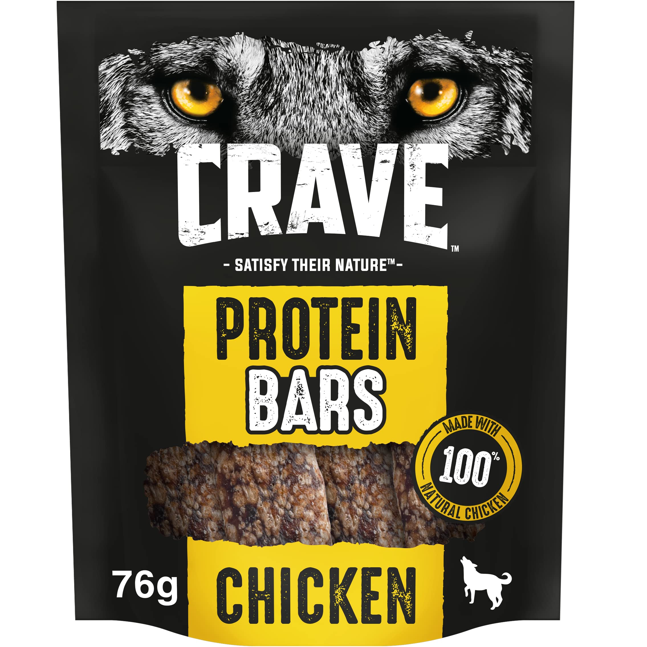 Product DescriptionCRAVE Chicken Protein Bars are dog treats made with high quality ingredients, including 100 Percent natural chicken, providing a delicious source of dog protein for your pet. Made with no added artificial colours or flavours, your dog will instinctively love. CRAVE Chicken Protein Bars are made with no artificial colours or flavours. CRAVE Chicken Protein Bars come in a fresh resealable pack to help keep your dog chews fresh. Premium dog treats that every canine is bound to love.IngredientsPotato Starch, 100% Natural Dried Chicken Liver (17.7%, equivalent to Chicken Liver 79.4%), Peas, Glycerol, Pea Starch, Minerals, Sucrose, Maltodextrin, Sunflower OilBox ContainsDog Treat