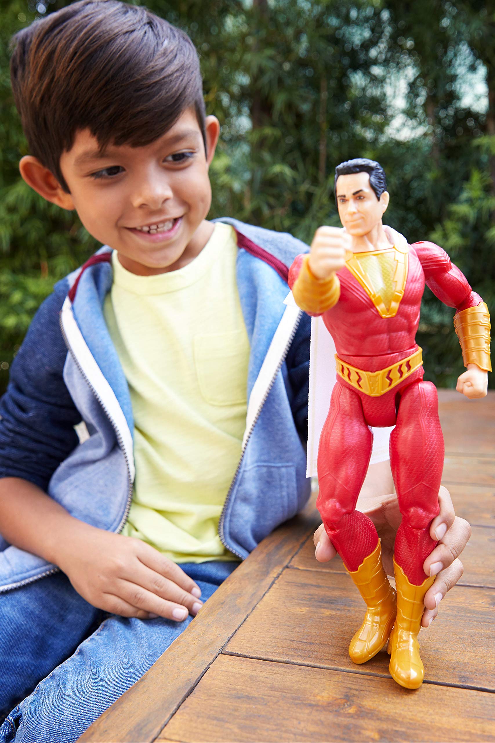 Get realistic Shazam! movie play with this large action figure featuring signature moves, lights and 20+ sounds and phrases! The Super Hero comes in his iconic red battle suit with golden belt, boots and a hooded cloth cape. When Super-Villains are in range, repeatedly squeeze his legs and he doles out super strength punches as his chest lights up and he says classic phrases! Attach the Lightning Launcher to his right arm and squeeze his legs again. Shazam! will auto fire one of three included Lightning Bolts with spring-loaded projectile force! Dr. Sivana and the enemies of man don't stand a chance against this exciting, realistic, lights and sounds Shazam! Comes in "Try me" package to test his Super Hero features in advance. Colors and decorations may vary.