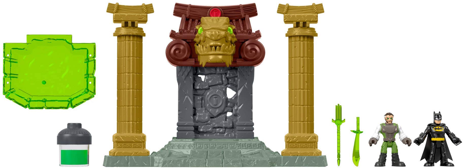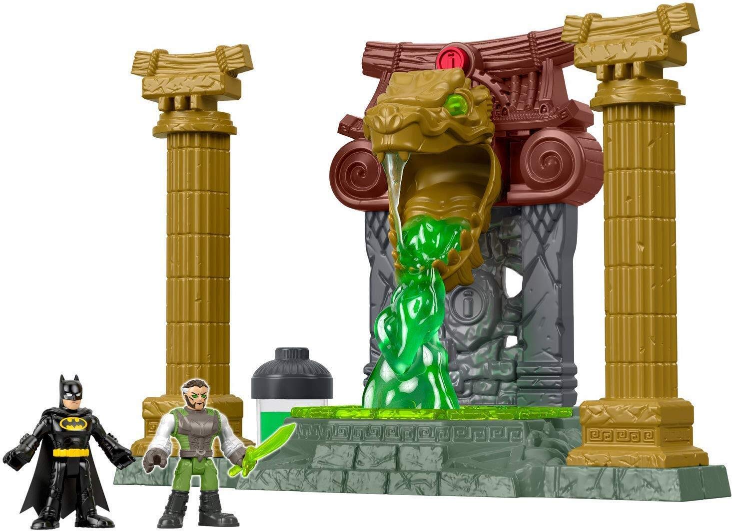 Product DescriptionPreschoolers can create their own exciting DC Super Friends adventures with this Imaginext Ooze Pit playset. Ra's al Ghul hopes the power of the ooze pit can help him finally defeat the Caped Crusader. Pour the green ooze into the dragon's head, then press the red button to send it flowing down on the figure in the center. Can Batman defeat this extra-powerful Ra's al Ghul That's for your young Super Hero to decide! Imaginext Imagine What's Next!Brand StoryImagine… a world where kids bring fantastical adventures to life as they play! Imaginext playsets and figures-designed by Fisher-Price-plus your child’s growing imagination make it happen. Kids are the heroes (and storytellers) as they’re transported to the days of dinosaurs or dragons or the worlds of Batman, Power Rangers or SpongeBob. Whether kids use Imaginext toys and playsets to act out real-life situations or invent whole new worlds, they’re learning about themselves and others and developing thinking and problem-solving skills while they play.