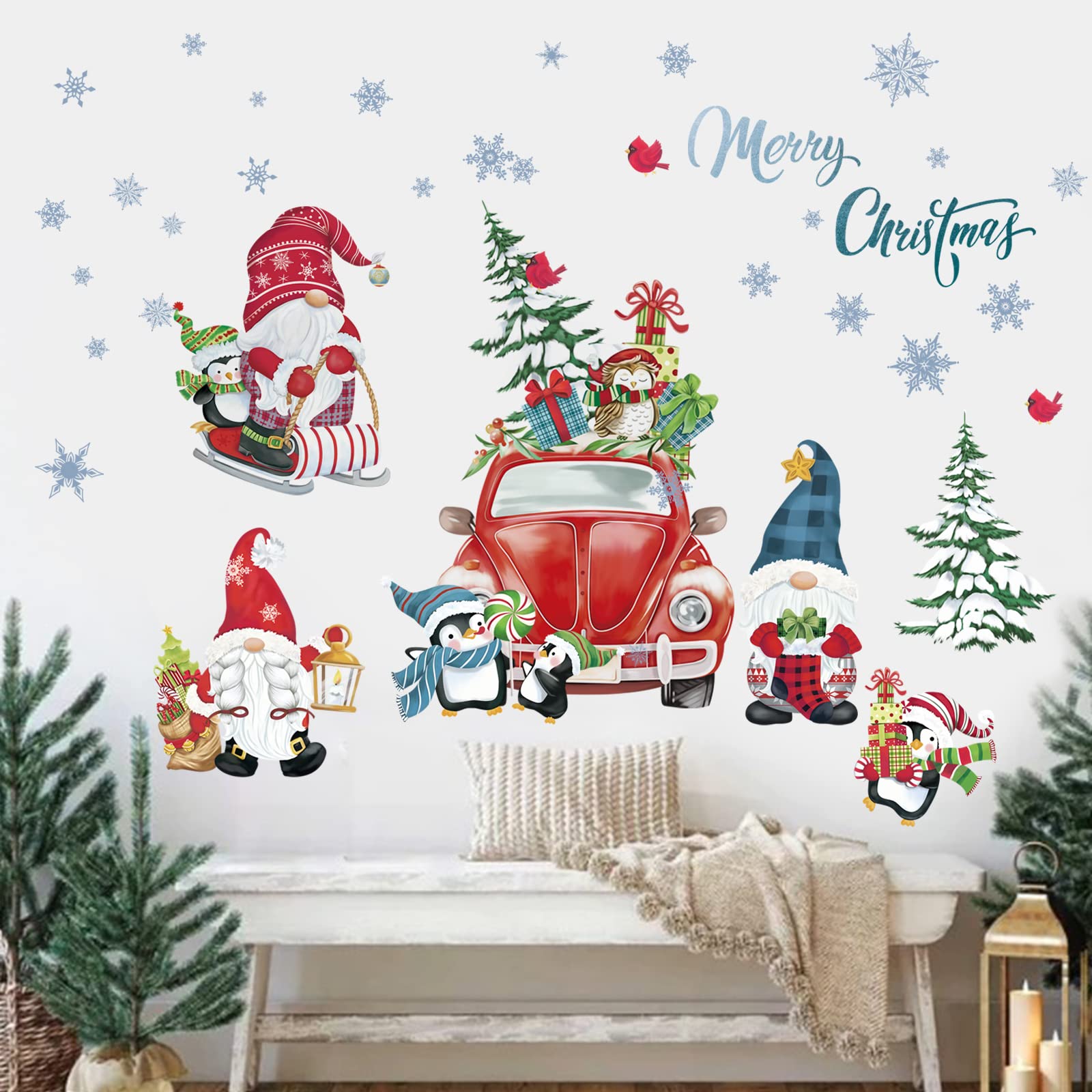 decalmile Christmas Red Car Gnome Window Wall Decals Christmas Trees Winter Wall Stickers Room Door Party Christmas Window Showcase Wall Decorations