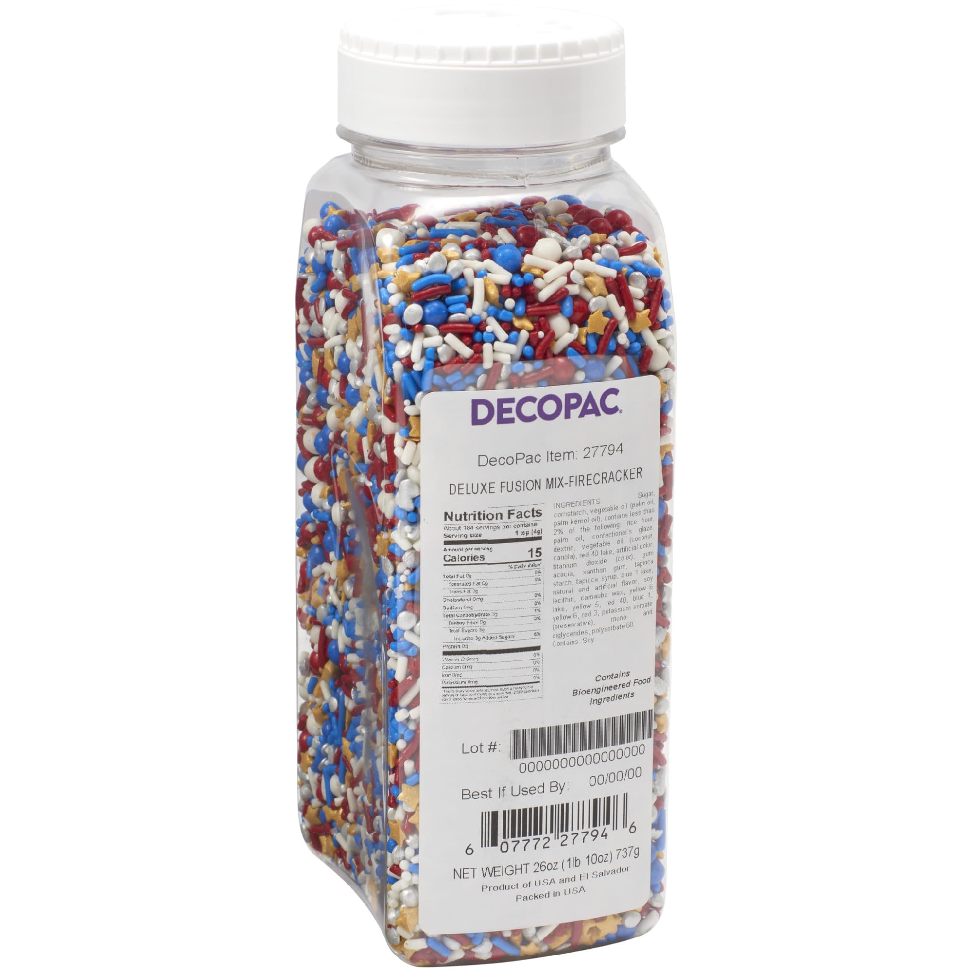 DECOPAC Firecracker Deluxe Fusion Mix, 26oz, Fancy Patriotic Candy Sprinkles in Handheld Container, Edible Sprinkles For Celebration Cakes, Cupcakes, Cookies and Donuts, Multicolored - Red, White, and BlueFusion mixes offer a combination of sprinkles, quins, nonpareils, pearls, gold stars, confetti, and sanding sugars. These food-safe edible sprinkles can be rolled into royal icing, scattered on top, or used in cake batter or cookie mixes. Kosher cupcake sprinkles, free of hydrogenated oils.These fancy sprinkles add vibrant color and texture to cakes, cookies, cupcakes and other baked goods as well as ice cream and confections.The easy to use hand-held container makes it easy to use a little or a lot of this sanding sugar and store the rest away. They stay fresh in your cupboard.Preferred Sprinkle Mix of Professionals - DecoPac sprinkles are the choice of professional cake decorators and bakers worldwide. They appreciate the unequalled quality, consistency, and results they offer.Add some flair to your cake case with this premium sprinkle blend! Blends offer a fully edible variety of different shaped and sized sprinkles, quins, nonpareils, pearls, and sanding sugars. Conveniently pre-mixed and packaged in a 26 oz. handheld container.