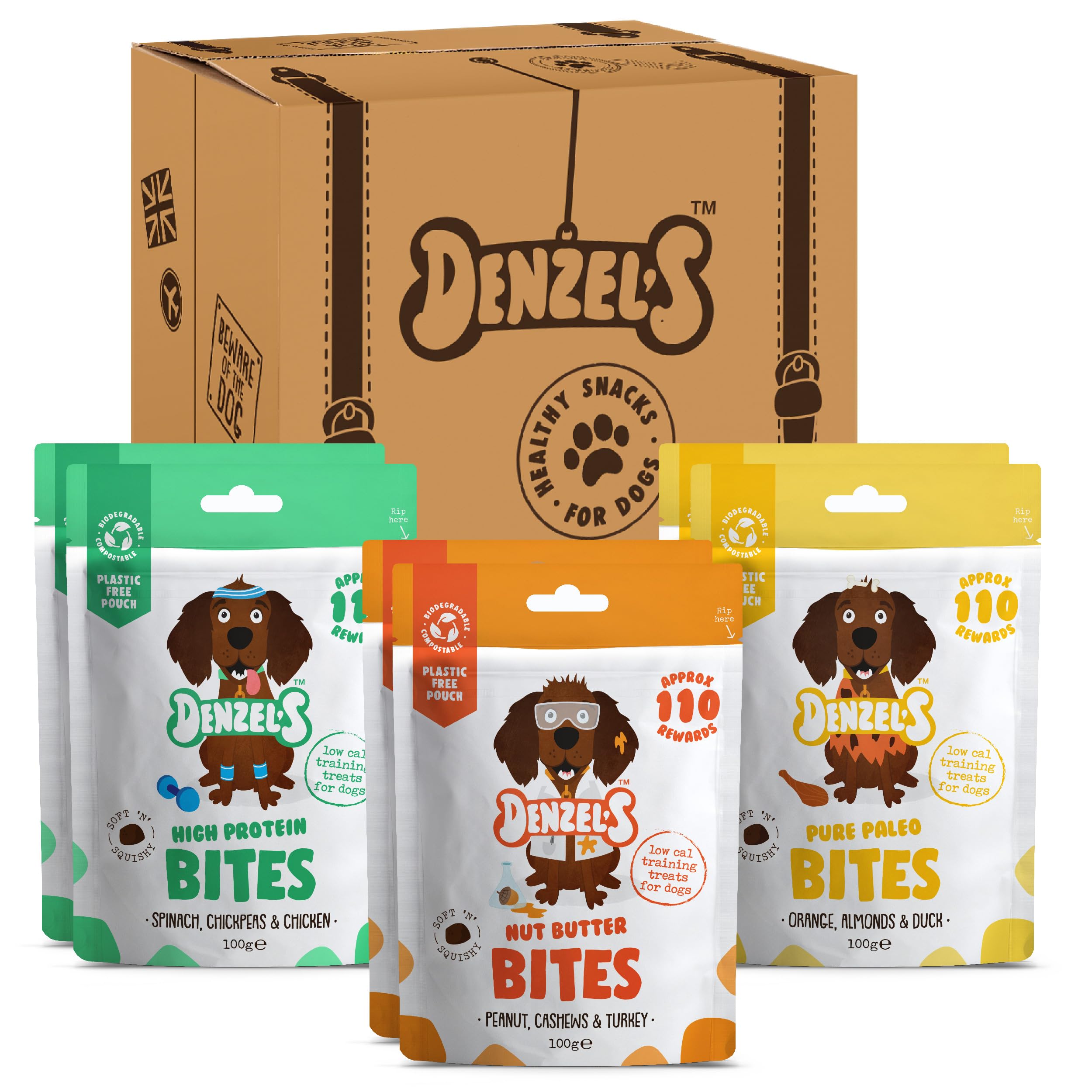 Product DescriptionDenzel's soft, squishy bites are made from 100% natural ingredients, gently baked in the UK into tasty, bite-size treats. Don't worry they're low cal so perfect for training or on-the-go! Denzel has packed up a Meat Medley of healthy dog snacks for your pooch (6 x 100g Bites): Each Meat Medley Bundle includes two packs of each: 2 x Nut Butter Soft 'n' Squishy Low Cal Training Treats - Peanut, Cashews & Turkey (100g) 2 x High Protein Soft 'n' Squishy Low Cal Training Treats - Spinach,xChickpeas & Chicken (100g) 2 x Pure Paleo Soft 'n' Squishy Low Cal Training Treats - Orange, Almonds & Duck (100g) Grain-free , Low Sugar, Nothing Artificial, Single-Source Protein. 100% Plastic-free biodegradable pouchIngredientsHigh Protein Soft 'n' Squishy Low Cal Training Treats - Composition: Chicken 35% (Chicken & Chicken gravy), Chickpea flour (15%), Sweet Potato, Vegetable Glycerine, Egg, Spinach. That’s it.Analytical constituents:Crude Protein 23.5%, Crude Oils & Fats 13.3%, Crude Fibre 2.1%, Crude Ash 5.9%, Moisture 18%, 274kcal/100gNut Butter Soft 'n' Squishy Low Cal Training Treats -Composition: Chickpea flour, Turkey (18%), Sweet Potato, Vegetable Glycerine, Nut Butter 13% (Rapeseed Oil, Peanuts, Cashew Nuts, Coconut oil). That’s it.Analytical constituents:Crude Protein 20.4%, Crude Oils & Fats 11.6%, Crude Fibre 2.2%, Crude Ash 5.2%, Moisture 18%, 289kcal/100gPure Paleo Soft 'n' Squishy Low Cal Training Treats -Composition: Chickpea flour, Duck (18%), Sweet Potato, Vegetable Glycerine, Rapeseed Oil, Linseed, Almonds (0.5%), Sunflower seeds, Orange Oil, Sesame Seeds, Turmeric. That's it.Analytical constituents:Crude Protein 20.1%, Crude Oils & Fats 13.4%, Crude Fibre 2.2%, Crude Ash 5.3%, Moisture 18%, 283kcal/100gDirectionsSit, Stay 1. This is a complimentary food for dogs only, not humans 2. Feed as a treat or reward, do not overfeed 3. Store in a cool dry place (away from your pup) 4. Keep your dog's water bowl topped up regularly 5. Suitable for dogs of all shapes and sizes over 16 weeksBox ContainsEach Meat Medley Bundle includes two packs of each: 2 x Nut Butter Soft 'n' Squishy Low Cal Training Treats - Peanut, Cashews & Turkey (100g) 2 x High Protein Soft 'n' Squishy Low Cal Training Treats - Spinach, Chickpeas & Chicken (100g) 2 x Pure Paleo Soft 'n' Squishy Low Cal Training Treats - Orange, Almonds & Duck (100g)
