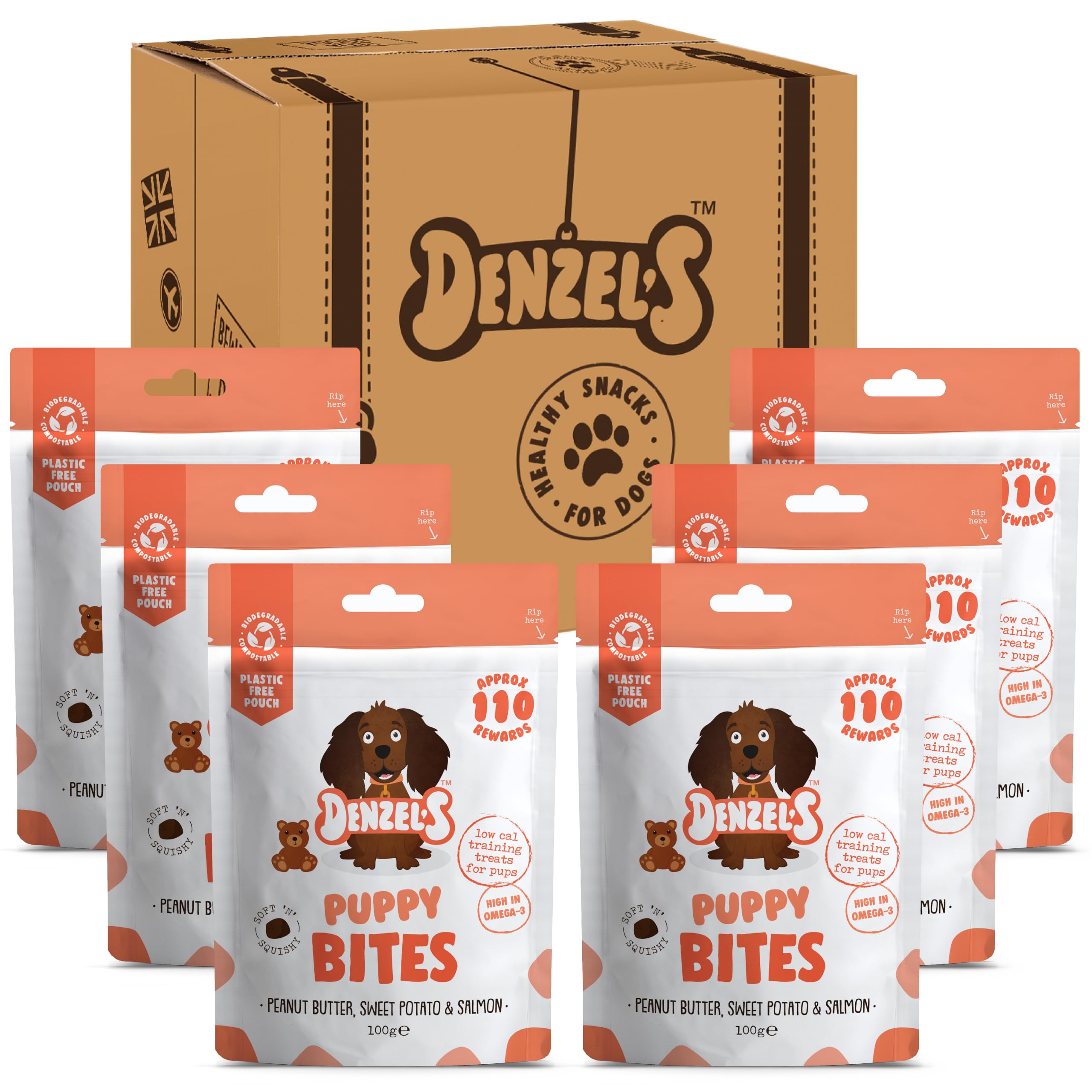 DescriptionProduct Description"Denzel's soft, squishy bites are made from 100% natural ingredients, gently baked in the UK into tasty, bite-size treats. Don't worry they're low cal so ideal for training and perfect for puppies from 8 weeks old. * Grain-free * * Low Sugar * * Nothing Artificial * * Single-Source Protein * * 100% Plastic-free pouch *"IngredientsPuppy Soft 'n' Squishy Low Cal Training Treats - Composition: Chickpea flour, Salmon (18%), Sweet Potato (17%), Vegetable Glycerine, Peanut Butter 13.1% (Peanuts, Cold pressed Rapeseed Oil, Rapeseed Oil, Coconut Oil), Linseed, Salmon Oil. That’s it. Analytical constituents: Crude Protein 21.5%, Crude Oils & Fats 11.7%, Crude Fibre 2%, Crude Ash 5.5%, Moisture 18%, 272kcal/100gDirectionsSit, Stay 1. This is a complimentary food for dogs only, not humans 2. Feed as a treat or reward, do not overfeed 3. Store in a cool dry place (away from your pup) 4. Keep your dog's water bowl topped up regularly 5. Suitable for puppies of all shapes and sizes over 8 weeksBox ContainsEach box contains 6 x Puppy Soft 'n' Squishy Low Cal Training Treats - Peanut Butter, Sweet Potato & Salmon (100g)