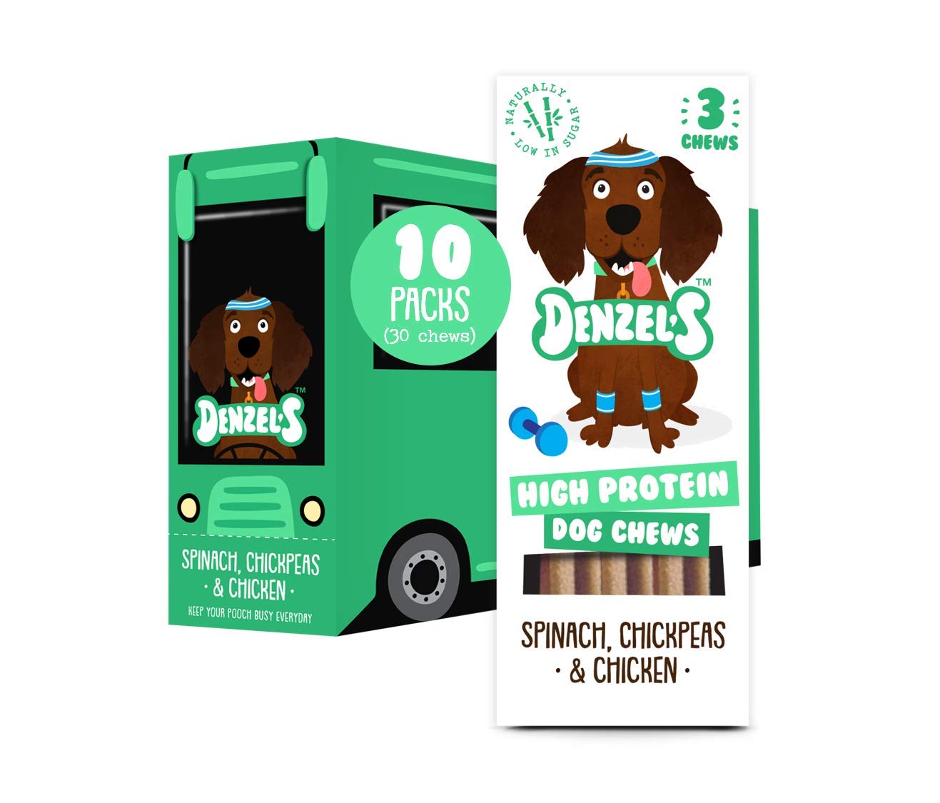 Product DescriptionDenzel's High Protein Dog Chews are made from 100 percent natural ingredients, gently baked in the UK into tasty, snack-sized chews. We use real chicken, spinach and chickpeas to cram this chew with healthy proteins providing a vital, lean source of energy to keep your dog fit and healthy. Spinach is high in Vitamin C and Iron to give extra immune support (and super shiny fur). Grain-free, naturally low in sugar and under 50 calories per chew. It is a perfect way to keep your pooch busy every day. No added any artificial additives, colourings and preservatives. It comes in busload pack, contains 30 chews.IngredientsChickpea Flour (30%), Vegetable Glycerine, Chicken 18% (Chicken & Chicken Gravy), Spinach (1%), Egg.Box Contains10 x High Protein Dog Chews 55 g