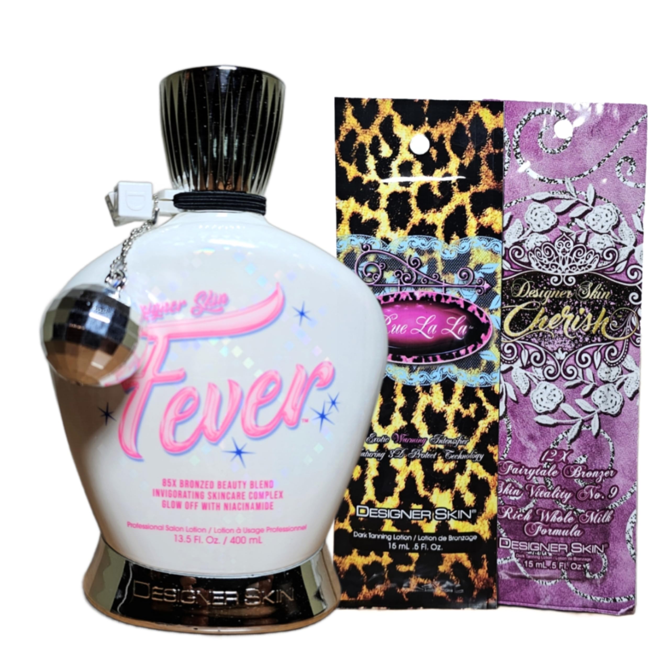 Designer Skin Fever 13.5oz 85X Bronzed Beauty DHA Bronzer Tanning Lotion 85X Bronzed Beauty Blend: Potent combination of cool-toned instant bronzers delivers intense color immediately upon application while DHA continues to develop and darken. Invigorating Skincare Complex: Provides a Ceramide to the skin to help prevent aging, improve skin barrier function, boost skin hydration and increase skin smoothness. Sodium PCA is a valuable humectant that draws new moisture to the skin while retaining hydration for a supple, healthy appearance. Age Rebellion: a mixture of amino acids and a Collagen stimulating peptide that work in unison to help fight the signs of aging. Glow Off: Niacinamide, a skin-loving vitamin, is known to improve dull, uneven skin tone to help boost brightness while enhancing skin radiance and luminosity. Pure Luxury Silicone Blend: A mixture of the most luxurious silicones, blended to perfection that glide on the skin effortlessly for a lush experience. This also helps to spread the high levels of instant bronzers for an even, flawless tan. ATO Inhibitor: Deodorizing agents and delicious fragrance notes keep skin smelling fresh. Silicone Blend, Niacinamide, Amino Acids, Collagen, DHA & Natural Bronzers White Peach Oasis Fragrance 85X Bronzed Beauty Blend Invigorating Skincare Complex Age Rebellion Glow Off Pure Luxury Silicone Blend ATO Inhibitor Silicone Blend, Niacinamide, Amino Acids, Collagen, DHA & Natural Bronzers Fragrance White Peach Oasis