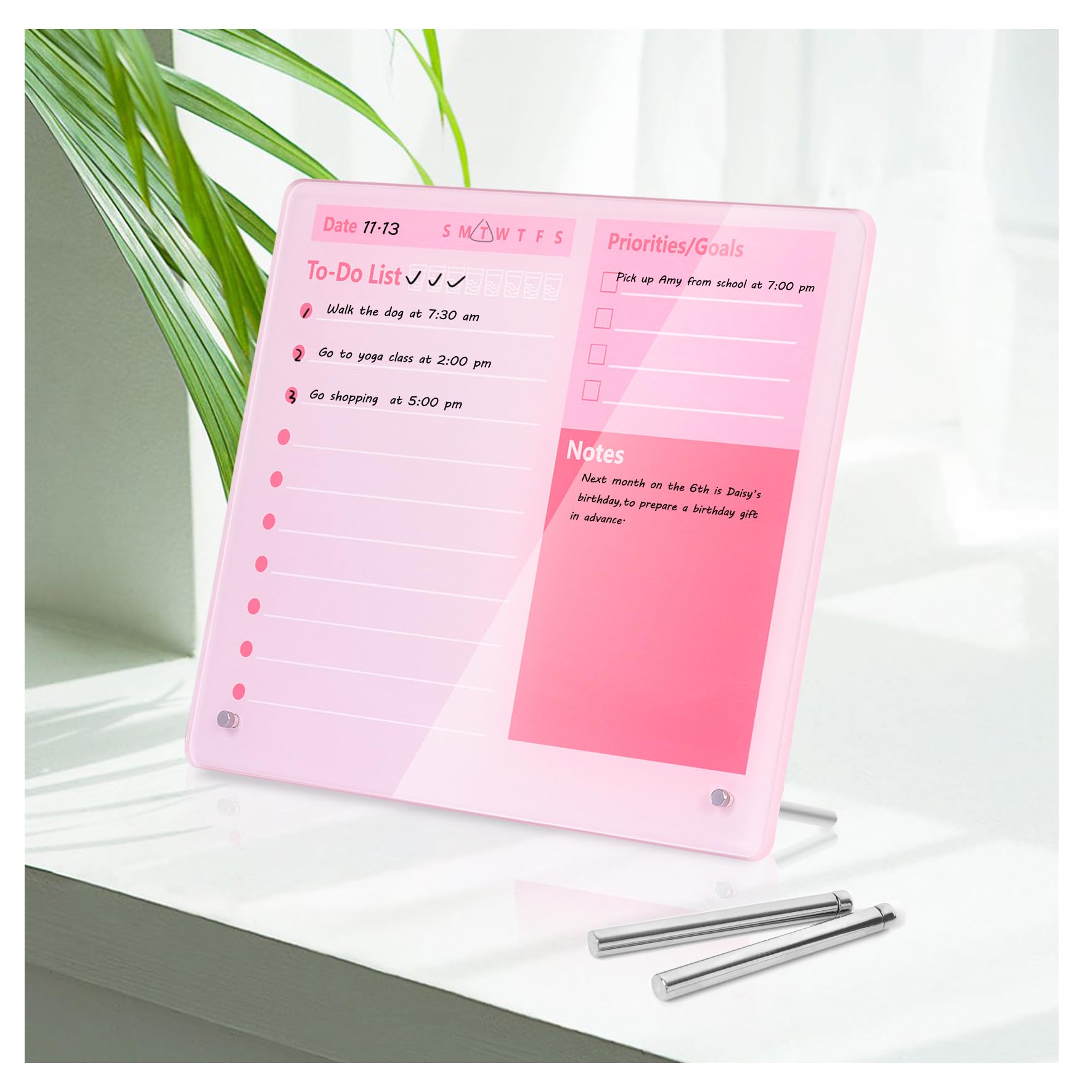 1. Thickened acrylic material, strong and stable, acrylic is not easy to break 2. Desktop message board with enough writing space. Daily schedule, with added priority activities. Make you more focused and productive than ever 3. Fashion design, multi-scenario application. Perfect for your office, kitchen, den, bedroom or anywhere. The fresh Barbie pink color is full of fashion and adds vitality and color to your life 4. Easy to write and erase. Thick acrylic whiteboard has a smooth surface and is durable. It's very easy to write and erase without worrying about stains