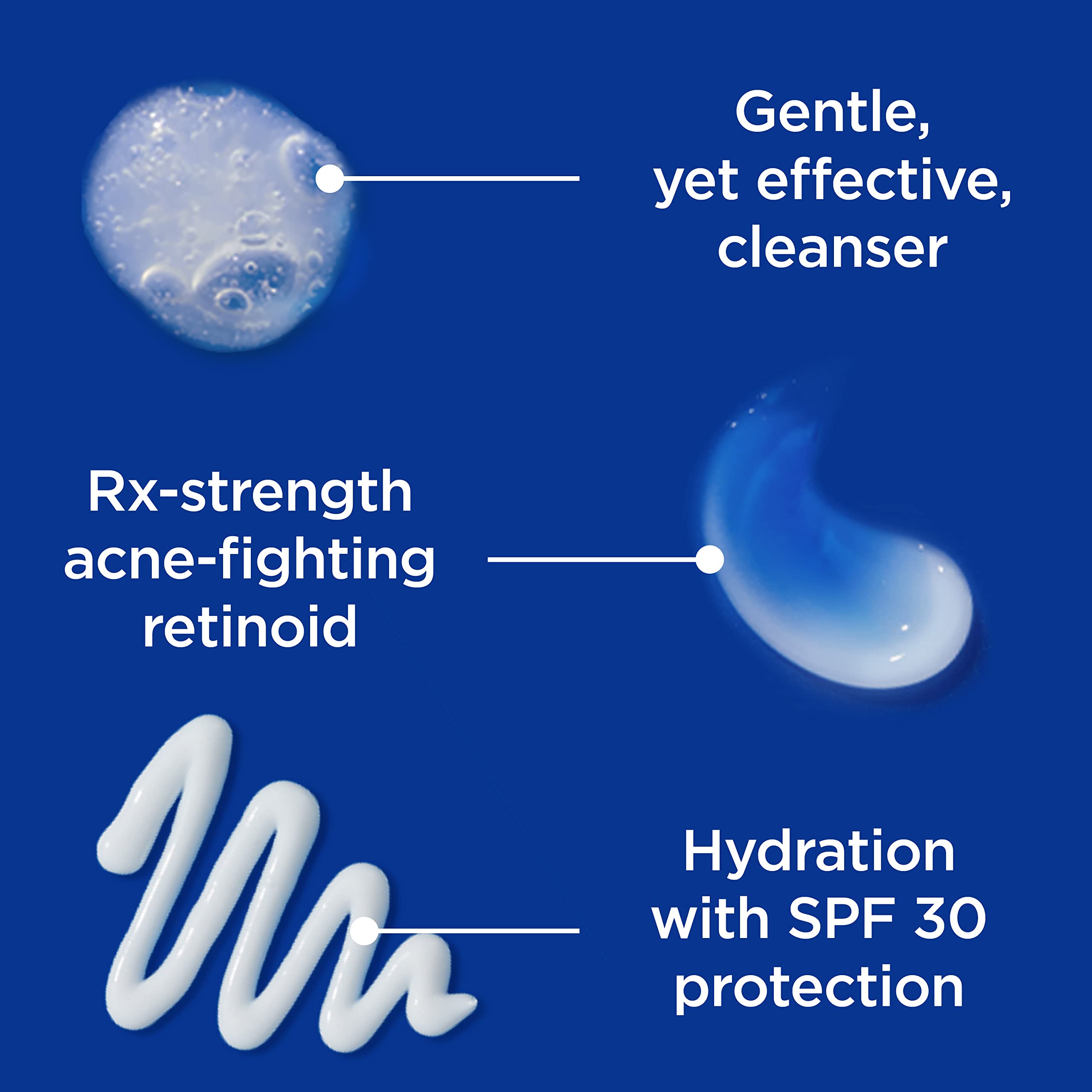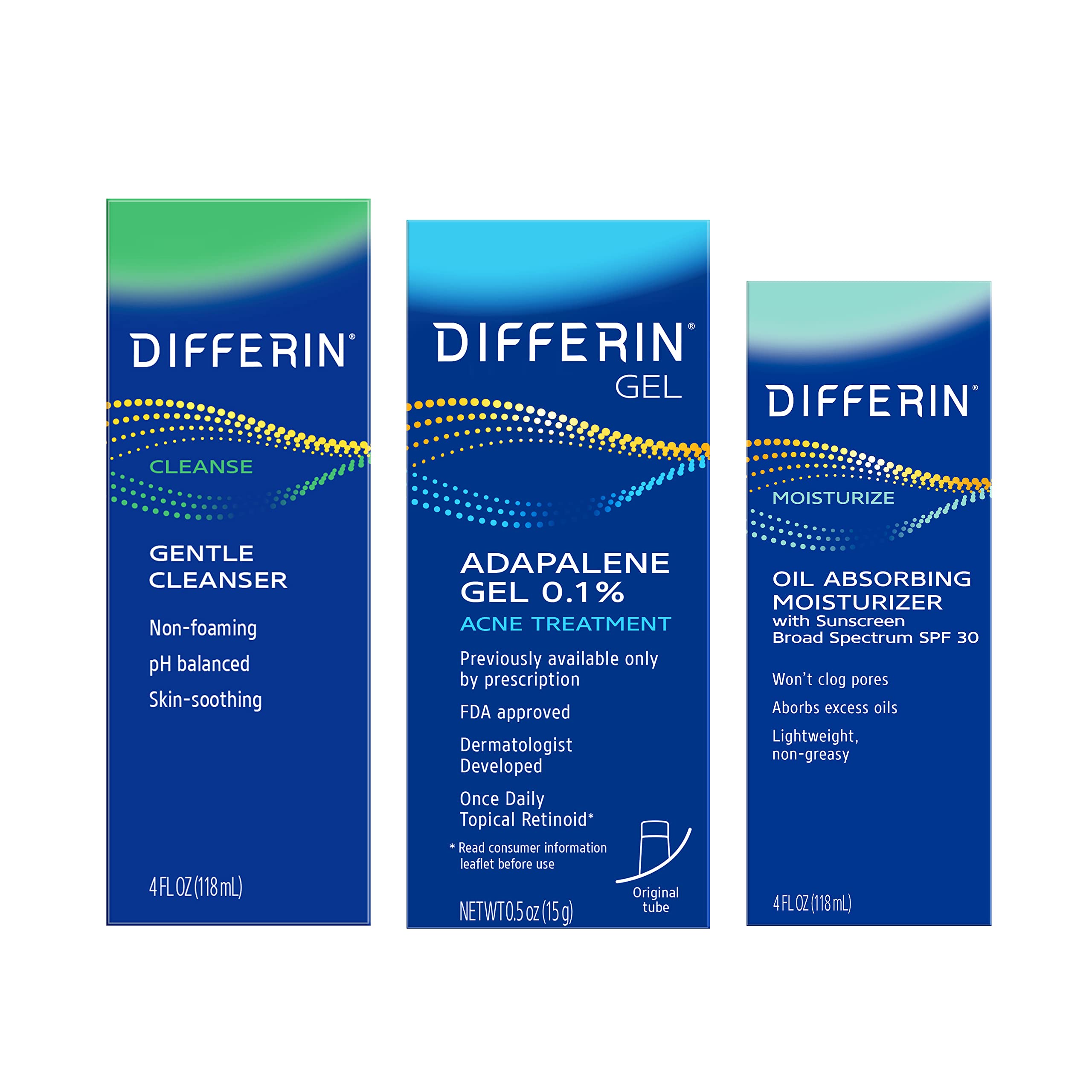 The Differin Clear Skin Set contains a dermatologist recommended combination to treat acne. Differin Gentle Cleanser is specially formulated to be gentle enough that it won’t dry out or strip skin of its natural oils or emollients, but tough enough to remove dirt, makeup and other impurities. It conditions as it cleanses and can be used with or without water. Differin Gel Acne Treatment contains adapalene, an Rx-strength acne-fighting retinoid, that clears breakouts where they start (works deep into pores in 5 minutes), helps prevent new acne from forming, and as a result, can restore skin’s overall tone and texture. When used as directed, you could start to see results in as little as 1 week, and when used every day, Differin Gel can help reduce up to 87% of acne in just 12 weeks (Cunliffe et al 1998, Galderma Laboratories). Differin Oil Absorbing Moisturizer with SPF 30 protects skin from the sun (a must-have for retinoid users), without clogging pores. It’s oil free, lightweight, and an integral part of a daily skincare routine thanks to its broad-spectrum SPF 30 UVA/UVB protection.
