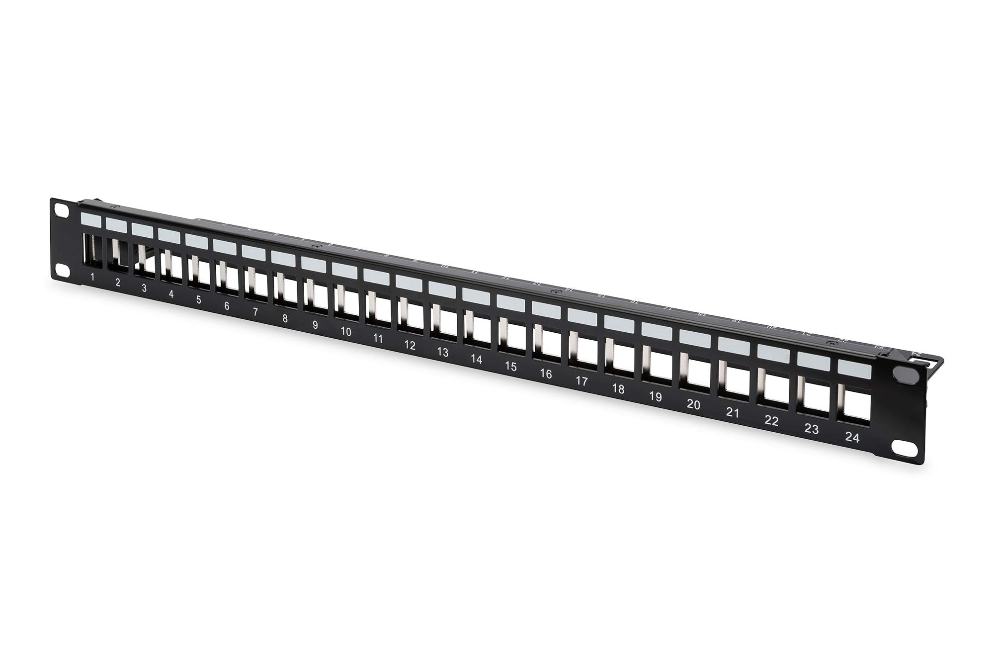 Product DescriptionHigh-quality patch panel with easy installation. The network distributor is easy to assemble and thanks to its low height of only 1U, you can make the most of the available space in the network cabinet. The installation cables can be easily connected to the back of the patch panel thanks to sufficient distance between the individual connections. This patch panel allows you to wire up to 24 network sockets in no time at all.The advantages at a glance:Reliable and fast data transfer Easy cable connection with fixation Multifunctional cable application. Robust steel casing Technical features:Keystone type: straight. Areas of use: 483 mm (19 inch) distribution cabinet. Standards: ISO/IEC 11801 3rd Ed., EN 50173-1, EIA/TIA 568-C Suitable for 483 mm (19 inch) cabinet mounting. Suitable for shielded Digitus Keystone modules and couplings Central earth connection Casing material: 1.5 mm SPCC cold-rolled sheet steel, powder-coated. Material standard: EN 10 130 (1991), BS 1449, NFA 36/401, DIN 1623, UNI 5866, UNE 36-086, SIS, JIS G 3141, ASTM, SAE, NFA 36/401. Ground rail material: galvanised steel. Earth wire: 18 AWG, 40 cm Operating temperature: -20°C to +70°C (ISO/IEC 11801, EN 50173-1, ANSI/TIA/EIA 568°C). Number of sockets/couplings: 24 Connector type: RJ45 8(8) Shielded: yes. Number of height units: 1U Colour: black. RAL number: 9005. Mounting Type: 482.6mm (19") Mounting Height: 44 mm. Width: 483 mm. Depth: 15 mm. See for yourself and buy the high-quality brand patch panel from Digitus ProfessionalLegal DisclaimerProduct is sourced and shipped from the European Economic Area (EEA). Product is genuine original from manufacturer authorized distributors.Box ContainsDigitus 19 Inch Modular Patch Panel for Keystone Modules