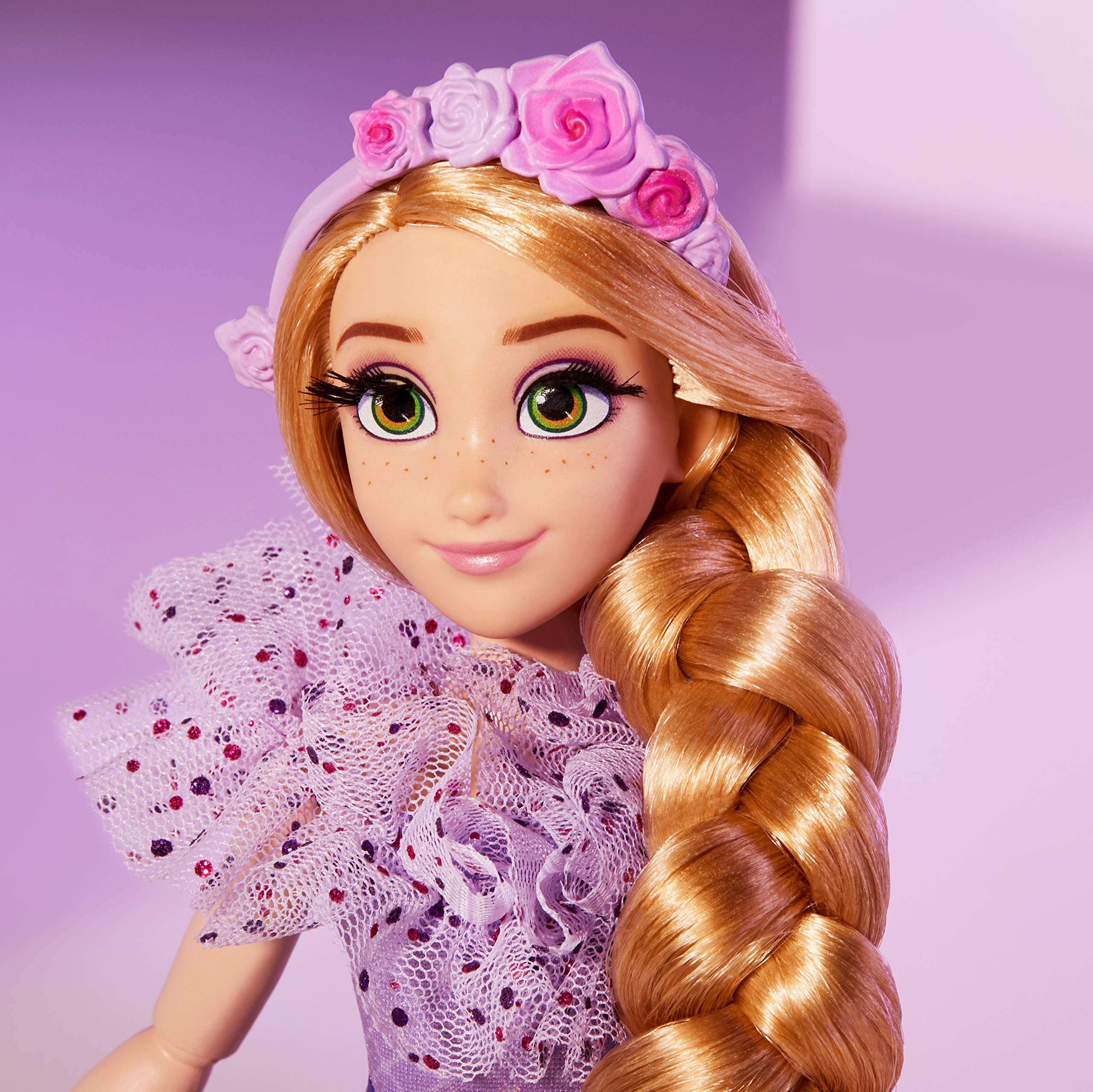 Starring Disney's Style Series! In Style Series number 04, beloved Disney Princess Rapunzel is stepping out of the movies and into the modern world in a beautifully designed dress that blends contemporary elegance and her iconic style from the animated favorite, Tangled. Fans will delight in collecting this stunning toy with a style inspired by Rapunzel's signature style.Rapunzel shines as bright as floating sky lanterns in this contemporary style, fit for a Princess living in our world. This truly romantic gown features a dramatic neckline and layers of soft, sparkly tulle, with delightful hints back to her roots like a beautiful lavender hue and sun purse. She also includes a removable pair of shoes and a flower headband to tie her whole ensemble together. Her flowing blonde hair will remind fans of their favorite Princess from Disney's classic movie, Tangled. Fans can collect other dolls in Disney's Style Series, including a Belle doll and Ariel doll, to take their collection from classic to contemporary. (Each sold separately. Subject to availability.)Copyright Disney.Hasbro and all related terms are trademarks of Hasbro.