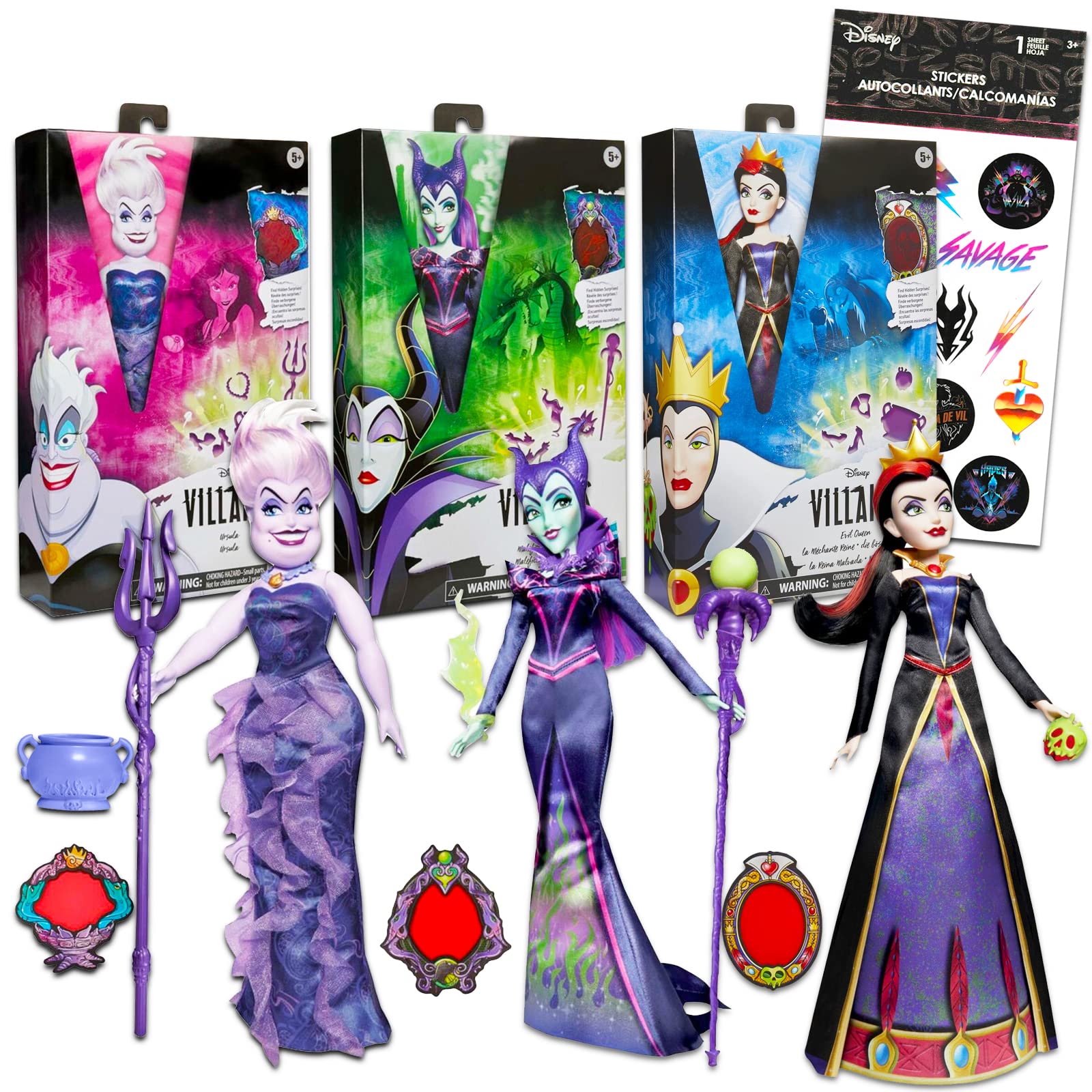Disney Villains Dolls Set for Girls - Bundle with 3 Disney Villains Dolls Featuring Maleficent, Ursula, and Evil Queen Plus Stickers | Disney Villains Gifts. This Disney Villains doll set comes with 3 dolls: 1 Maleficent doll, 1 Ursula doll, and 1 Evil Queen doll. Sure to be a hit with Disney fans of all ages, these villain dolls are great to give as a gift to your favorite Disney Villains enthusiast. Each Disney Villain doll comes with her own accessories, perfect for hours of creative play with friends or at a Disney Villains themed birthday party. Officially licensed Disney Villains dolls custom product bundle also comes with Disney Villains stickers.