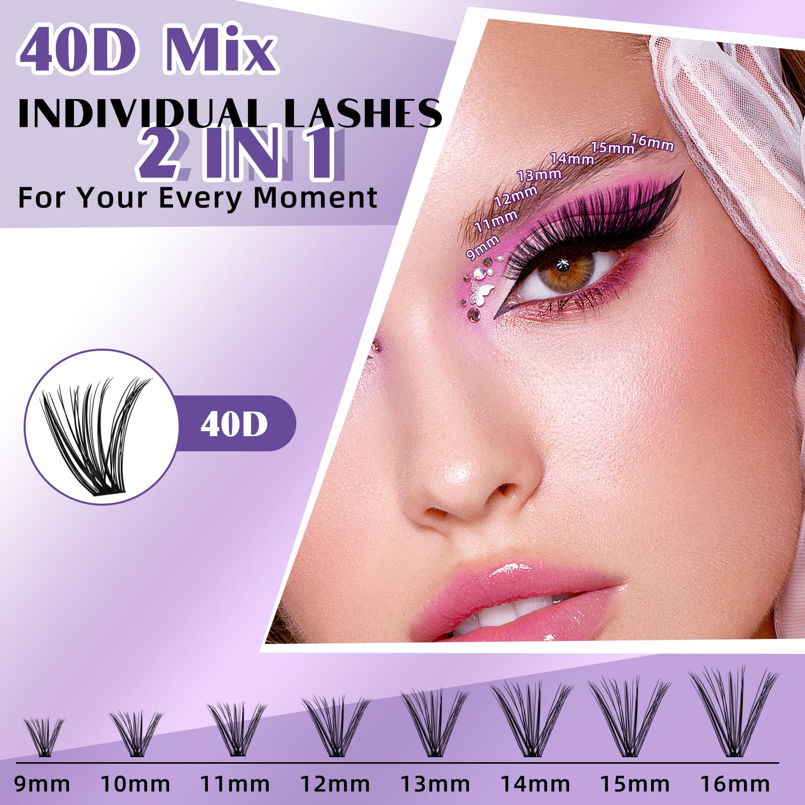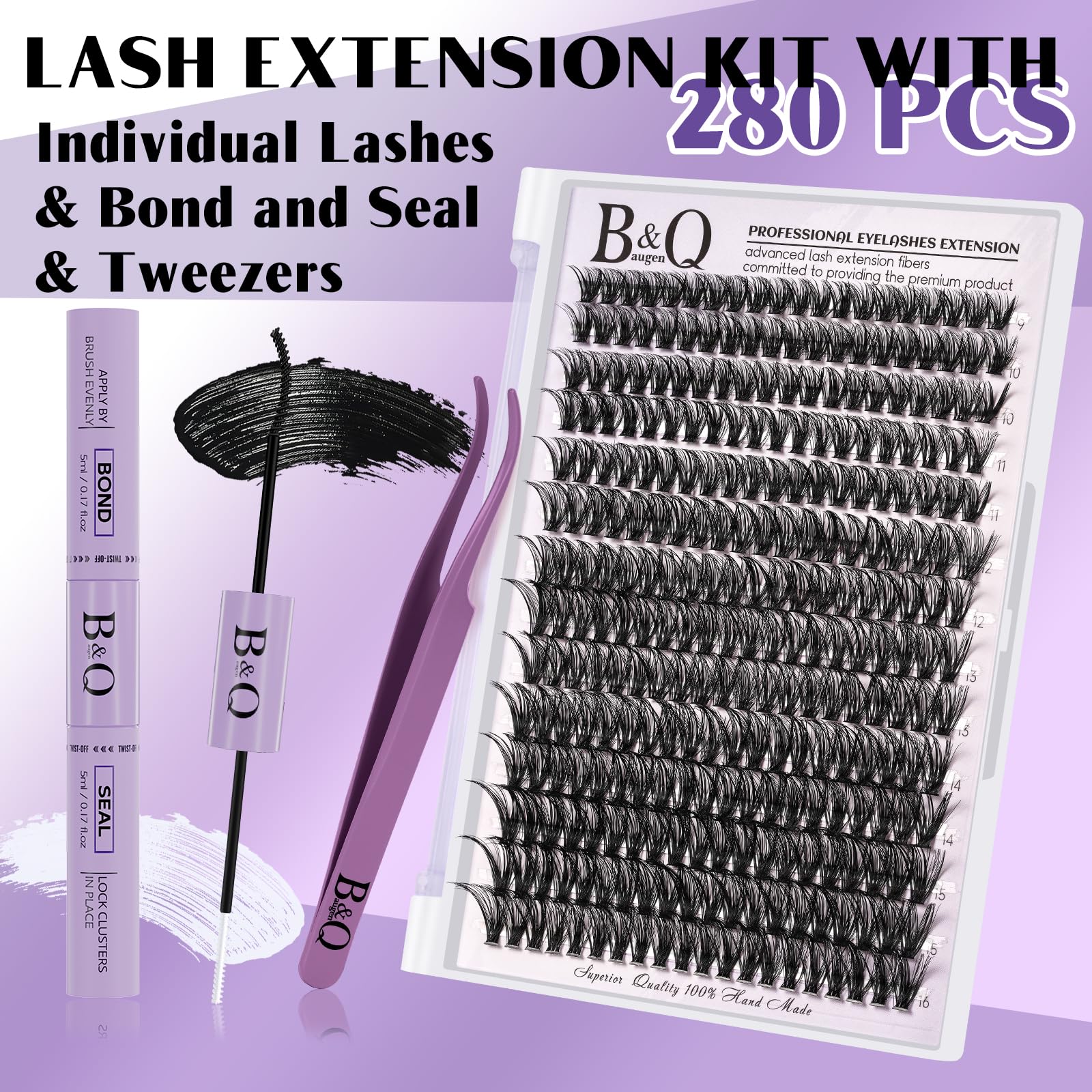 DIY Lash Extension Kit 280pcs Individual Lashes Cluster B&Q D Curl Eyelash Extension Kit Lash Clusters with Lash Bond and Seal and Lash Applicator Tool for Self Application (KIT,40D-C-9-16MIX)