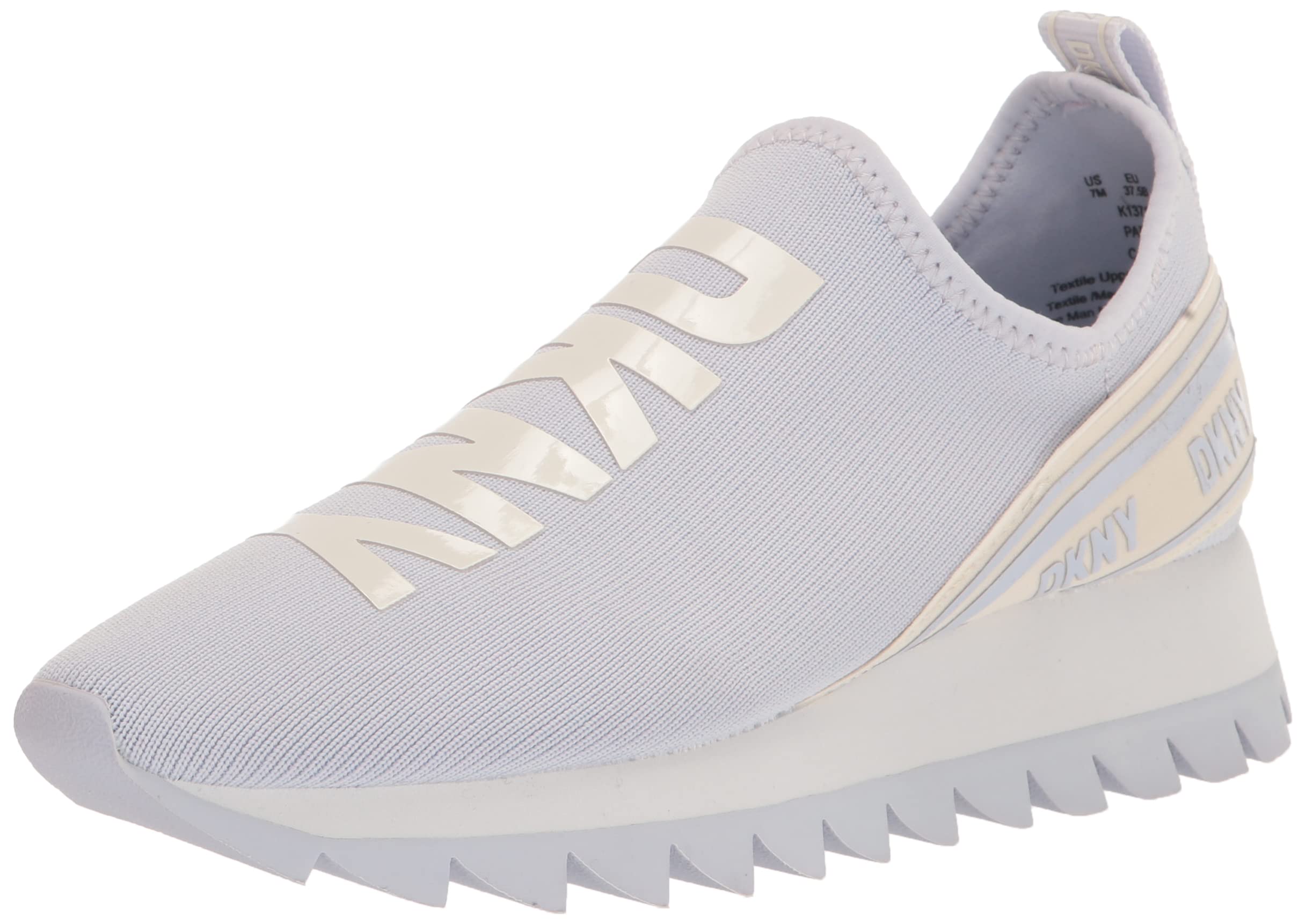 This DKNY womens Abbi sneaker is a knit rubber sole low-top logo sneaker