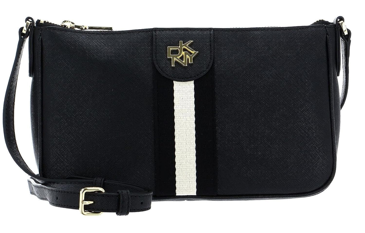 This black handbag from designer DKNY is a must have accessory for the modern fashionista on the go. Complete with a top zip closure. internal section and a stunning golden signature branding. A dapper accessory with golden hardware and a modern approach.