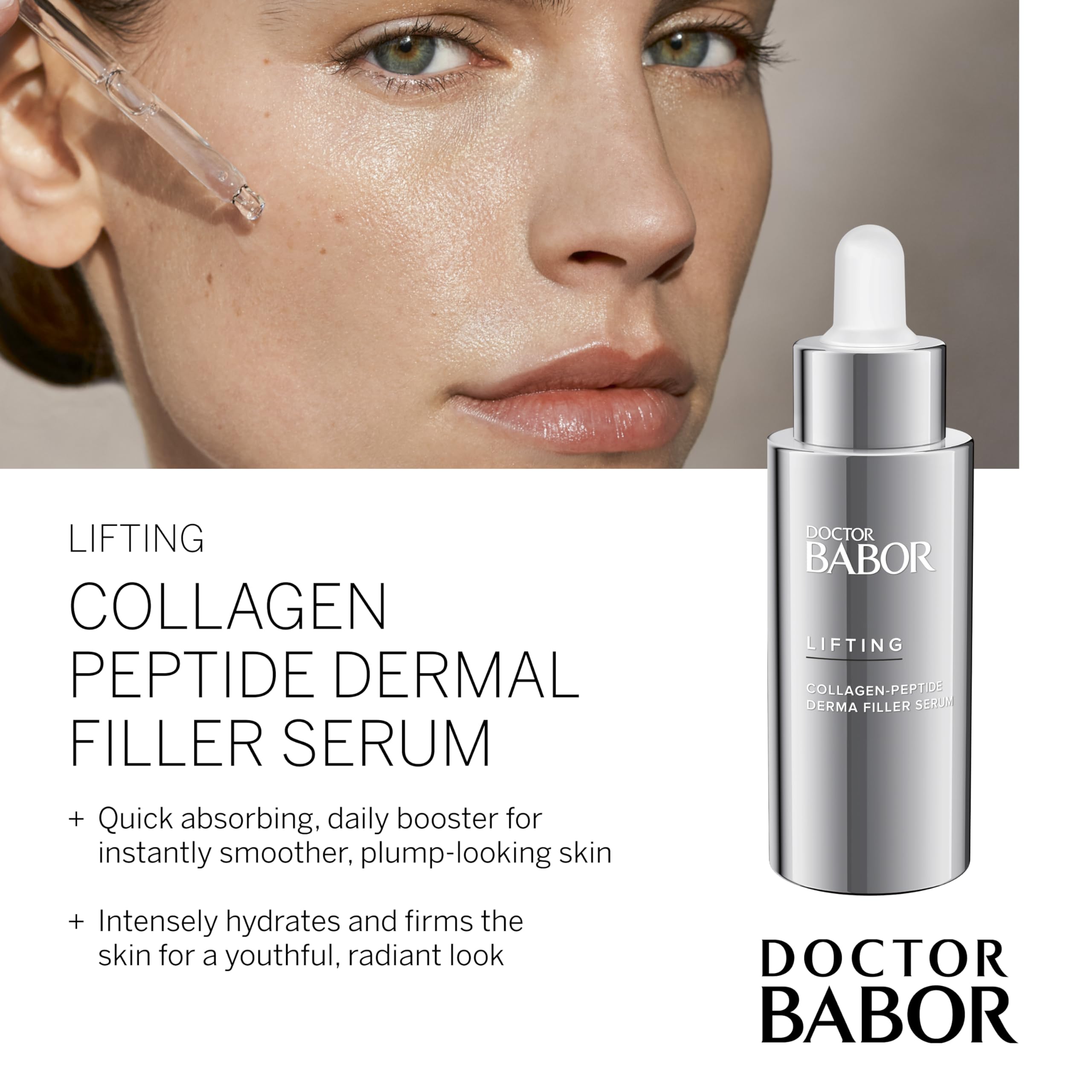 For instantly smoother, plump-looking skin, apply the light and quickly absorbed COLLAGEN-PEPTIDE DERMA FILLER SERUM for daily use.