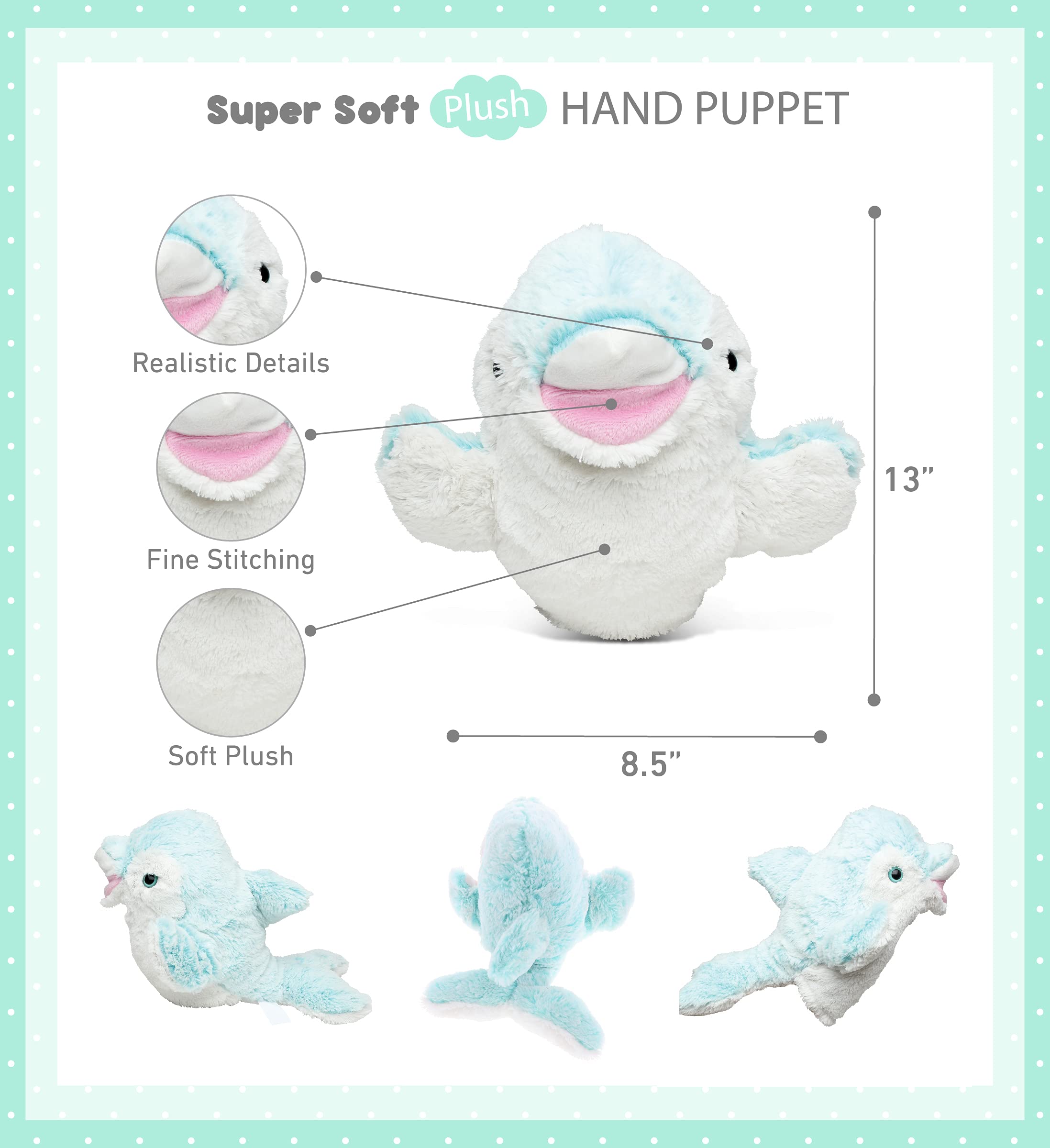 Entertain your little ones with cute hand puppets. DolliBu Dolphin Plush Hand Puppet is a charming animal toy that will make your kids enjoy an imaginary play with dolphin animals. Perfect toy for kids that they can bring with them anywhere they go for endless fun. A must-have puppet educational toy to nurture kids & make their skills development a fun and memorable experience. Hand puppet doll of an adorable dolphin figure for entertaining and learning activities through a puppet show. Perform a fun animal show for your little kids at home. Communicating with children using a puppet in a funny voice will help kids remember their lessons delivered in a memorable way. Serves as an educational toy puppet for family bonding while putting on a show that can be played indoors and outdoors. Animal puppet toys are great companion & entertainment toys for little kids during learning and imaginary role-play. Puppets may help parents & teachers provide an interactive learning style for children & students. Teachers can decorate classrooms and playrooms with puppet animals. Kids will love to have a pet that will serve as their go-to friend when they feel sad, scared, or upset. Includes 1 DolliBu Dolphin Plush Hand Puppet. Smiling fluffy dolphin plush has cute features like button black eyes and small snout. The dolphin's head & flippers are movable & can be controlled using the pinky & thumb fingers. Soft blue-colored faux plush fabric and fine stitching allows the performer to move its fingers freely & comfortably. The dolphin hand puppet is made of all new materials, premium quality polyester. Has a soft inner lining and fine stitching, with enough space for the fingers to comfortably control the movements that can be performed with the puppet. Fits comfortably from a toddler up to an adult hand. The puppet can be worn on either the left or right hand. To preserve the puppet's softness wash with cold water and air dry only. The hand puppet animal measures 9.5L x 6W x 4H.