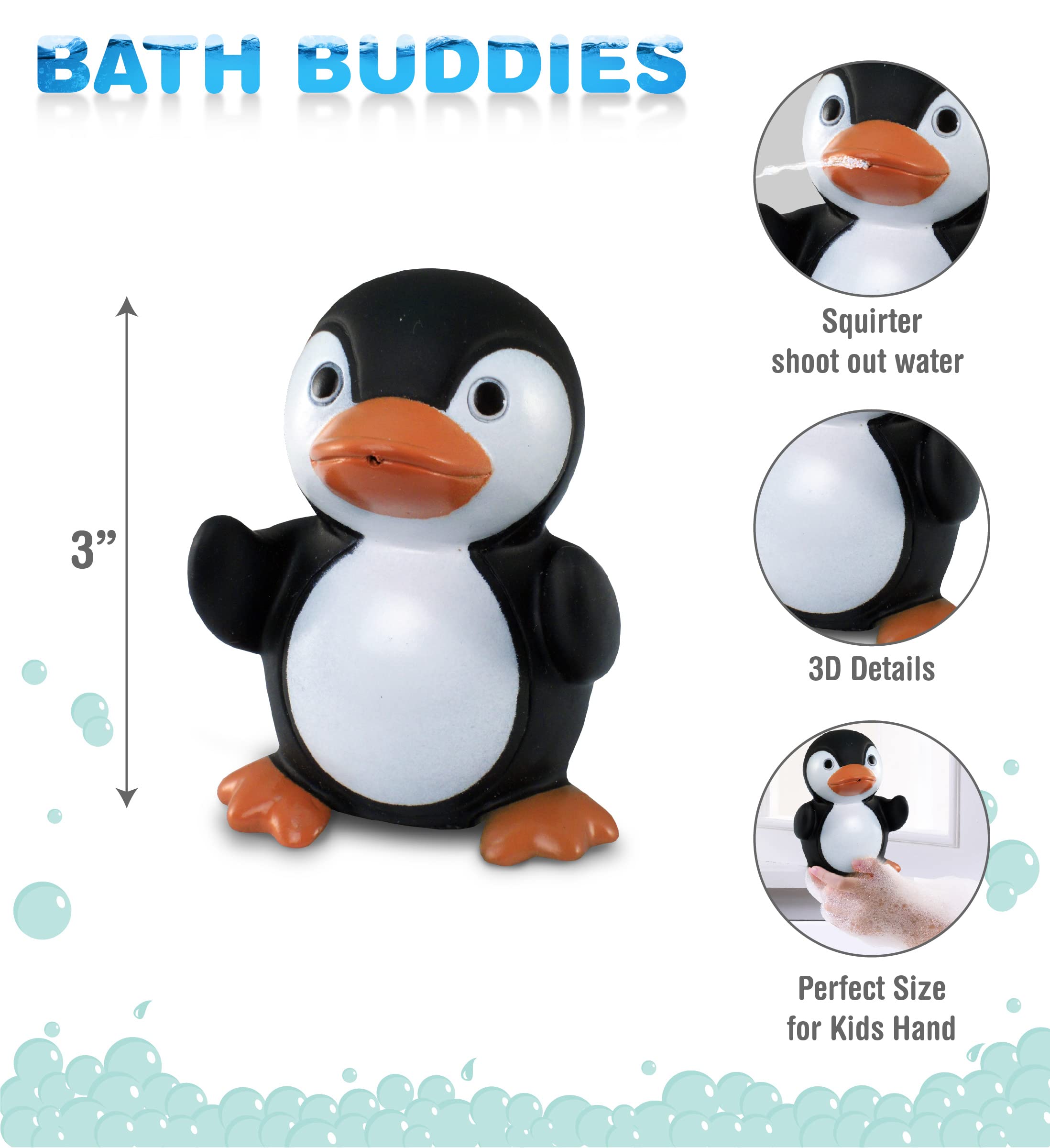 Entertain your little one with cute tub animal toys that will make them want to take a bath every single day. DolliBu Black Penguin Squirter Bath Toy is part of our cool ocean life collection of bath buddies & makes any water activity a joyous one. Ideally suited for the bath, pool, or the beach. Designed with lively colors & crafted with a perfect size for little hands to hold & squeeze. Cute animal bathtub toys or bathing toys are great for educating little children & expanding their knowledge about animals & colors. Perfectly sized baby tub toy that can be played within the bathtub, pool, or beach for endless fun & can also be played outdoors during imaginative pretend play. Use as cute toy decor for an animal-themed room! Penguin-shaped floaties for babies also make cute gifts for little kids. Make your kids look forward to bathtime! Bath squirties are perfect floating toys for kids who enjoy spending time in the water. A fun toy to play & share with siblings & friends in a tub or pool. Perfect for parents who want to make bath time fun & educational learning experience for their children. Ideal gift for expecting mothers or a giveaway party favor in a children's party. Includes 1 Black Penguin Bath Buddy Squirter Toy for kids. The ocean life bath toy features smooth, soft & rounded edges to ensure the safety of children while enjoying fun water games. Designed with soft rubber flippers & an orange bill. The black penguin shoots out water from a tiny hole when squeezed. Penguin Bath Buddy Squirter is a floating bathtub or pool toy, made of premium quality rubber materials. The penguin toy is durable, lightweight & is colored with non-toxic materials, which makes it safer & easier for children to play in the shower or while enjoying a swim. Preserve the cute bath squirter toy by hand washing, squeeze out all water & letting it dry before the next use to prevent any build-up. Penguin baby float squirter toy measures 3 inches, perfect fit for babies' little hands.