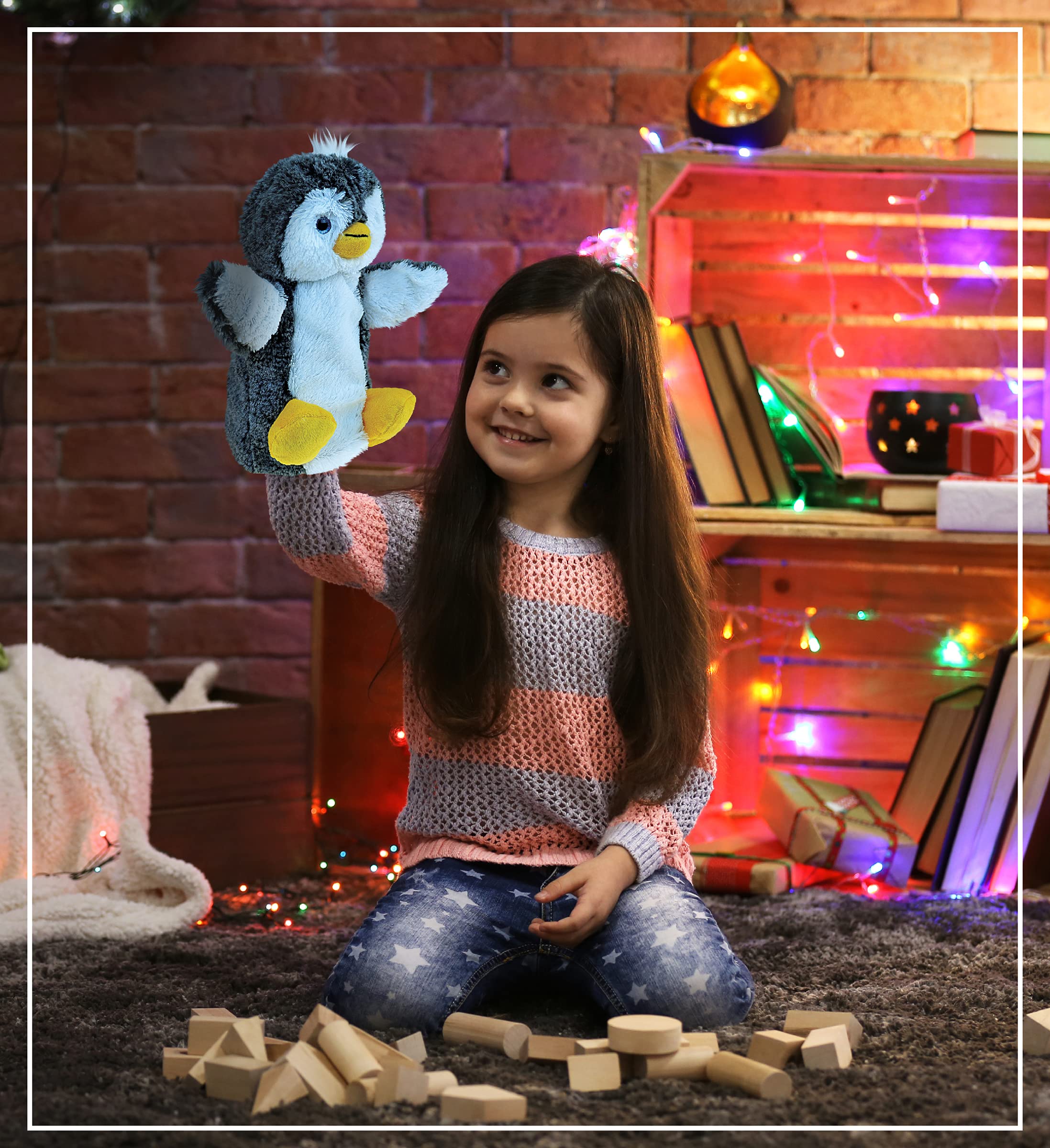 Entertain your little ones with cute hand puppets. DolliBu Penguin Plush Hand Puppet is a charming animal toy that will make your kids enjoy an imaginary play with wild animals. Perfect toy for kids that they can bring with them anywhere they go for endless fun. A must-have puppet educational toy to nurture kids & make their skills development a fun and memorable experience. Hand puppet doll of an adorable penguin figure for entertaining and learning activities through a puppet show. Perform a fun animal show for your little kids at home. Communicating with children using a puppet in a funny voice will help kids remember their lessons delivered in a memorable way. Serves as an educational toy puppet for family bonding while putting on a show that can be played indoors and outdoors. Animal puppet toys are great companion & entertainment toys for little kids during learning and imaginary role-play. Puppets may help parents & teachers provide an interactive learning style for children & students. Teachers can decorate classrooms and playrooms with puppet animals. Kids will love to have a pet that will serve as their go-to friend when they feel sad, scared, or upset. Includes 1 DolliBu Penguin Plush Hand Puppet. Smiling fluffy penguin plush has cute features like sparkling blue eyes and beak. The penguin head & hands are movable & can be controlled using the pinky & thumb fingers. Soft grey and white-colored faux plush fabric and fine stitching allows the performer to move its fingers freely & comfortably. The penguin hand puppet is made of all new materials, premium quality polyester. Has a soft inner lining and fine stitching, with enough space for the fingers to comfortably control the movements that can be performed with the puppet. Fits comfortably from a toddler up to an adult hand. The puppet can be worn on either the left or right hand. To preserve the puppet's softness wash with cold water and air dry only. The hand puppet animal measures 9?Lx7?Wx2?H.