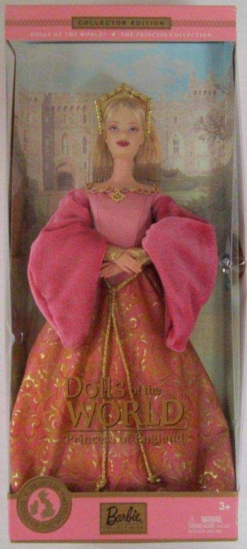 Princess of Englandâ„ Barbie doll wears a lovely gown featuring a rose colored satin bodice and a rosy pink skirt decorated with golden renaissance inspired patterns. The square neckline is edged with pink and golden trim. Soft rosy pink sleeves elegantly drape off her shoulder over a full golden undersleeve. Golden embellishments accent her outfit, including a golden cord that ties at her waist, a brooch, and a regal crown, based on the steeple-shaped headdresses of the era.