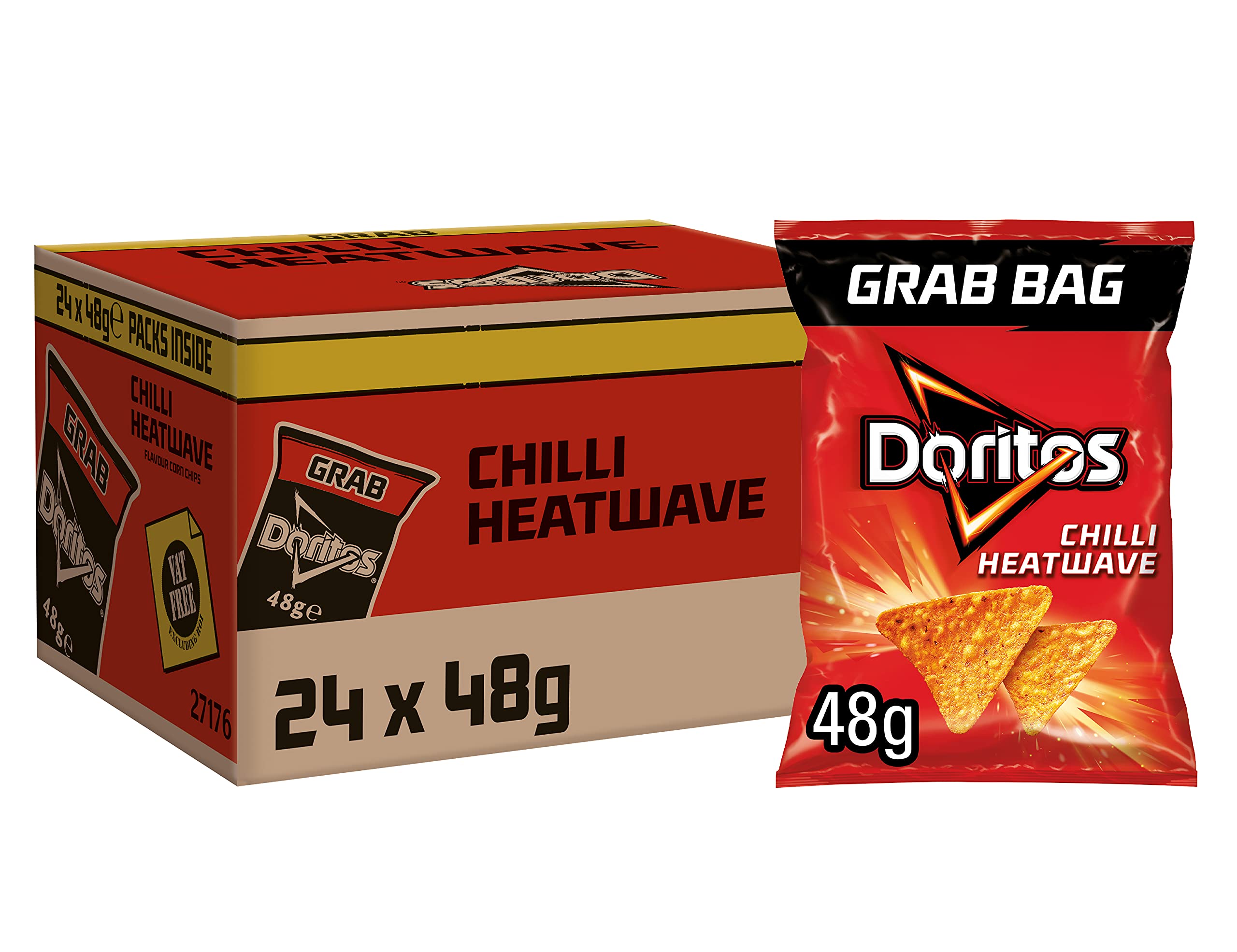 DescriptionProduct DescriptionAt Doritos we believe that no one should settle for boring snacks. When it comes to bold snacking experiences, we're where it's at. With a choice of intense flavours, full-on crunch and a range of sizes for every occasion, Doritos tortilla chips are the perfect snack for enjoying on-the-go or sharing with mates. Unleash the full Doritos experience with our range of crunchy tortilla chips and tasty dips. Bold crunch, bold flavours. Explore the full Doritos range at our website. With intense flavours and full-on crunch Doritos are the great tasting bold snack for when you're getting together with mates!IngredientsCorn (Maize), Vegetable Oils (Corn, Sunflower, Rapeseed, in varying proportions), Chilli Heatwave Flavour [Sugar, Flavourings (contains SOYA, WHEAT), Hydrolysed SOYA Protein, Acidity Regulators (Sodium Acetates), Flavour Enhancers (Monosodium Glutamate, Disodium 5'-Ribonucleotides), Onion Powder, Salt, Garlic Powder, Acids (Citric Acid, Malic Acid), Potassium Chloride, SOYbean, WHEAT, Colour (Paprika Extract)]DirectionsOpen pack and enjoyManufacturer Contact InformationWalkers Snack Foods Ltd., PO Box 23, Leicester, LE4 8ZU, UK.