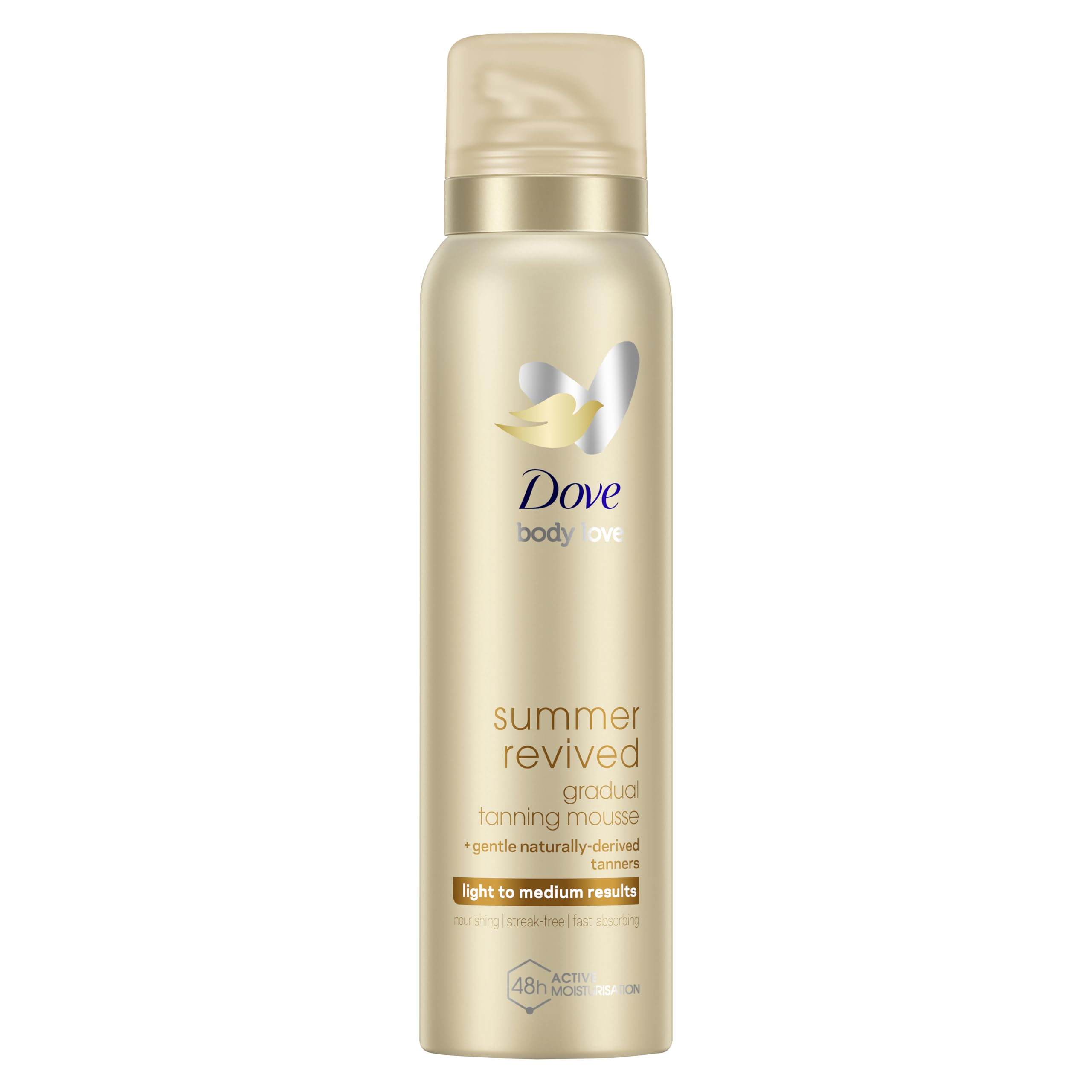 Dreaming of radiant summer skin? Get a beautiful, natural-looking glow all year round with Dove Summer Revived Gradual Tanning Mousse, a light-to-medium self-tanner that works with your skin to create a unique glow you’ll love. This lightweight self-tanning mousse has a nourishing formula to give you effective hydration while you build your self-tan. With naturally derived ingredients and 48-hour active moisturisation, this gentle tanning mousse helps your skin remain hydrated, leaving it feeling beautifully soft, with a natural-looking glow. If you’re looking to build a light-to-medium tan and find a shade that complements your unique skin, this self-tan mousse is for you. This tanning mousse formula helps you self-tan with no streaks and no mess, combining daily skin hydration with a buildable glow that you control. Over time, this gradual tanning mousse creates a long-lasting, natural-looking tan to make you glow from head to toe. How to use: For the perfect bronze glow, exfoliate your skin beforehand so you start with a smooth, even surface. Apply the tanning mousse in circular, even motions onto clean, dry skin for streak-free, sunless tanning. Let it dry before getting dressed, then wash your hands to avoid product build-up. Use daily until your desired self-tan is achieved, then reapply as needed to maintain a natural-looking summer glow. Try this: If you’re looking for tanning products that don’t cause streaks and mess, try switching from your instant tanner to a Dove gradual tanning mousse or gradual tanning lotion. The easy-to-use formula blends into your skin without mess - and it smells beautiful, too. Whether you’re after a light gradual tan or medium bronze glow, add this self tan mousse to your routine for a daily boost of confidence.IngredientsAqua, Glycerin, Isobutane, Dicaprylyl Ether, Ppg-3 Benzyl Ether Myristate, Dihydroxyacetone, Cetearyl Alcohol, Propane, Arachidyl Alcohol, Parfum, Tapioca Starch, Behenyl Alcohol, Phenoxyethanol, Cetearyl Glucoside, Prunus Amygdalus Dulcis Oil, Octyldodecanol, Coco-glucoside, Arachidyl Glucoside, Hydroxystearic Acid, Citric Acid, Butane, Ethylhexylglycerin, Stearic Acid, Polymethylsilsesquioxane, Glucose, Palmitic Acid, Tocopherol, Arachidic Acid, Alpha-isomethyl Ionone, Benzyl Alcohol, Citral, Citronellol, Coumarin, Geraniol, Hexyl Cinnamal, Limonene, LinaloolSafety WarningCaution: shake well. Apply a small amount of mousse and massage evenly onto clean and dry skin. A little goes a long way! Wash hands after use. Always apply a separate sunscreen product if spending time in the sun. Do not spray near eyes. Use only as directed. Danger: extremely flammable aerosol. Pressurised container: may burst if heated. Keep away from heat, hot surfaces, sparks, open flames and other ignition sources. No smoking. Do not pierce or burn, even after use. Protect from sunlight. Do not expose to temperatures exceeding 50 °c. Keep out of reach of children. Do not spray on an open flame or other ignition source.